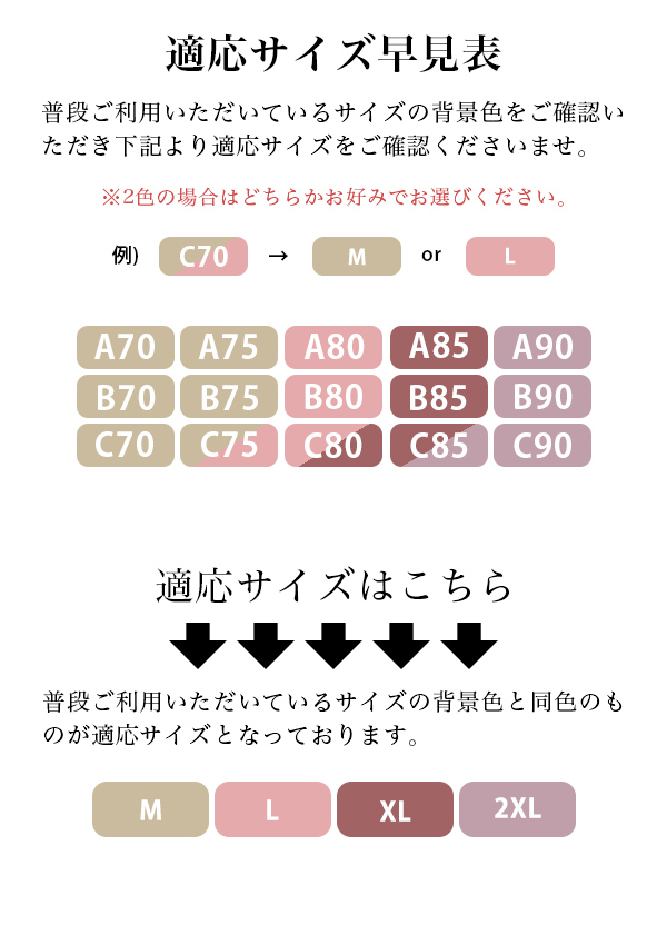 Mサイズ(A70,B70,C70,A75,B75,C75対応) Lサイズ(C75,A80,B80,C80対応) XLサイズ(C80,A85,B85,C85対応) 2XLサイズ(C85,A90,B90,C90対応) |