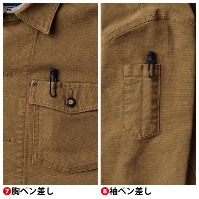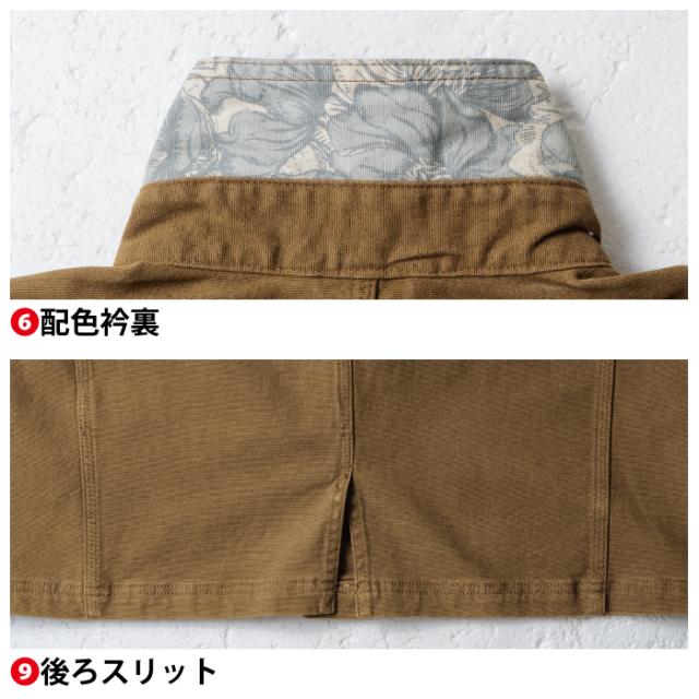 ◇機能:配色台衿・ブランドネーム・オリジナルドットボタン・フラップ裏配色・補強布・配色衿裏・胸ペン差し・袖ペン差し・後ろスリット・袖アジャストボタン・配色内ポケット・ボタンホールステッチ