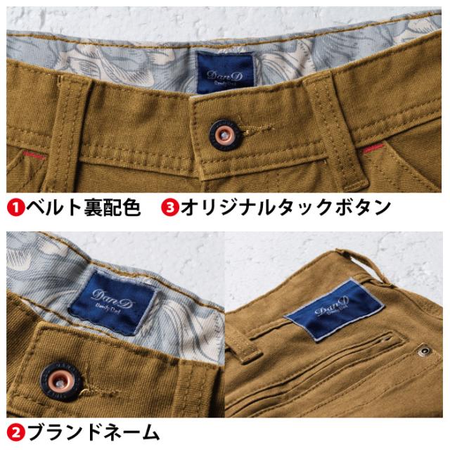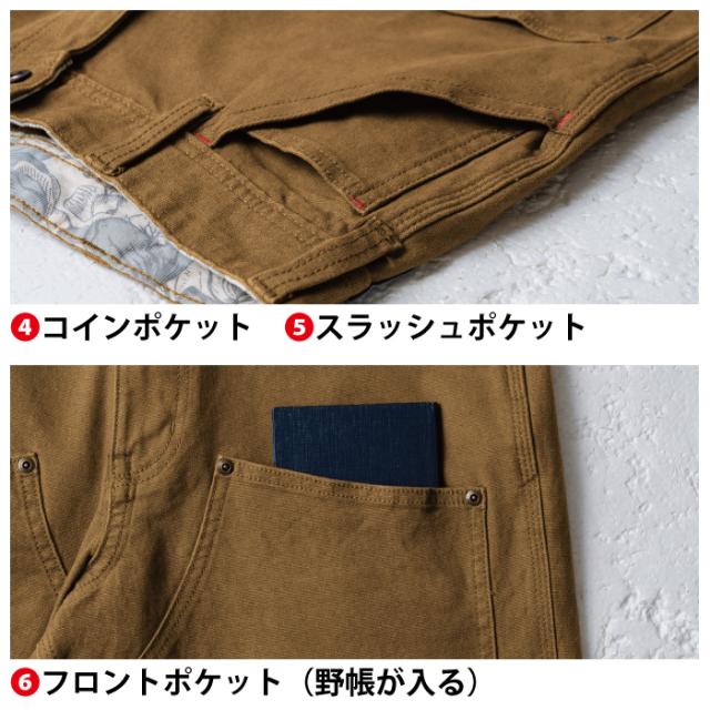 ◇機能:ベルト裏配色・ブランドネーム・オリジナルタックボタン・コインポケット・スラッシュポケット・フロントポケット(野帳が入る)・ひざ当て布・後ろファスナーポケット(野帳が入る)・補強布・左右ツールポケット