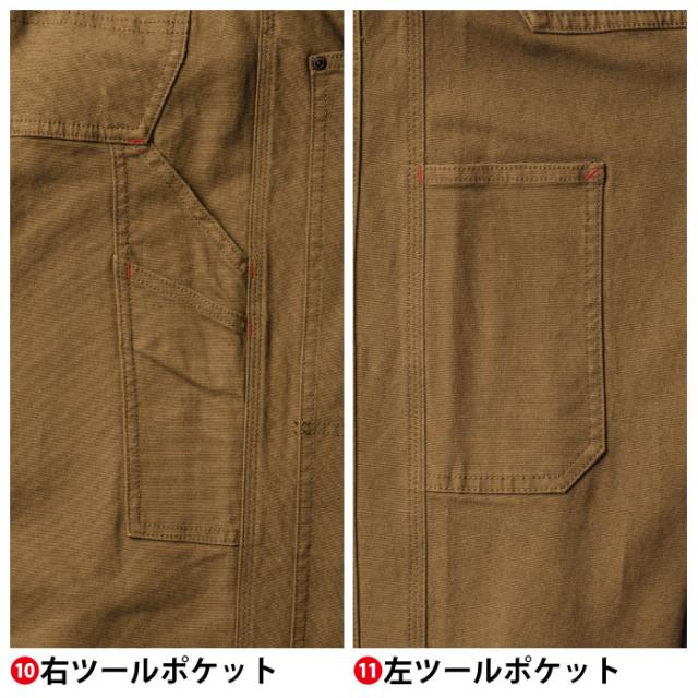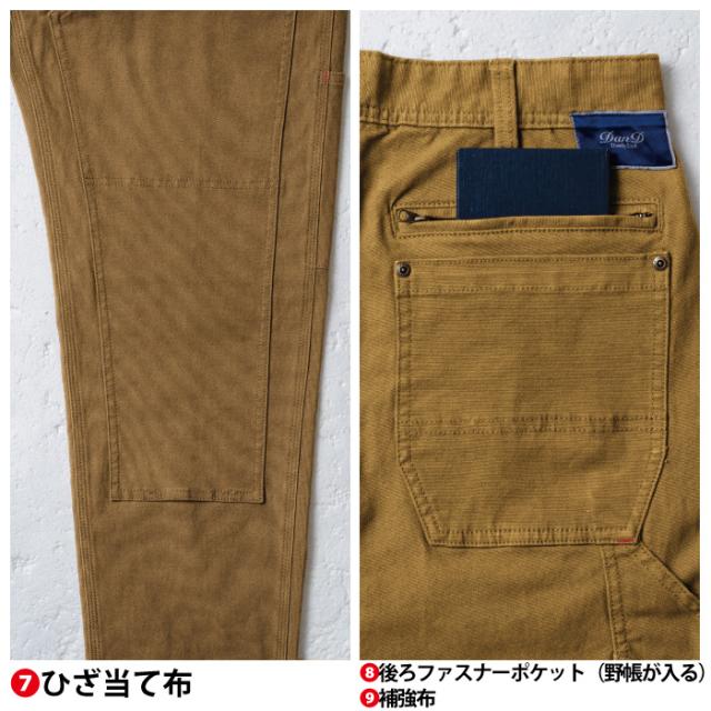 ◇機能:ベルト裏配色・ブランドネーム・オリジナルタックボタン・コインポケット・スラッシュポケット・フロントポケット(野帳が入る)・ひざ当て布・後ろファスナーポケット(野帳が入る)・補強布・左右ツールポケット