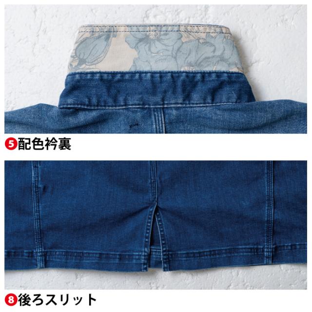 ◇機能:配色台衿・ブランドネーム・オリジナルドットボタン・補強布・配色衿裏・胸ペン差し・袖ペン差し・後ろスリット・袖アジャストボタン・配色内ポケット・ボタンホールステッチ