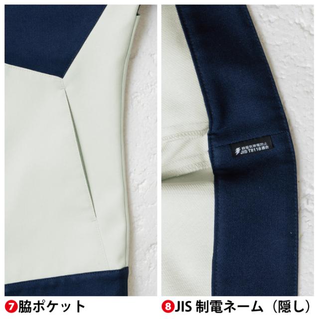 ◇機能:スタンドカラー・前立て・ドットボタン(隠し)・ネームループ・胸ファスナーポケット(野帳が入る)・脇ポケット・JIS制電ネーム・ノーフォーク・反射パイピング・袖ペン差し・胸ポケット・袖口ドットボタン(隠し)・JIS T8118規格適合