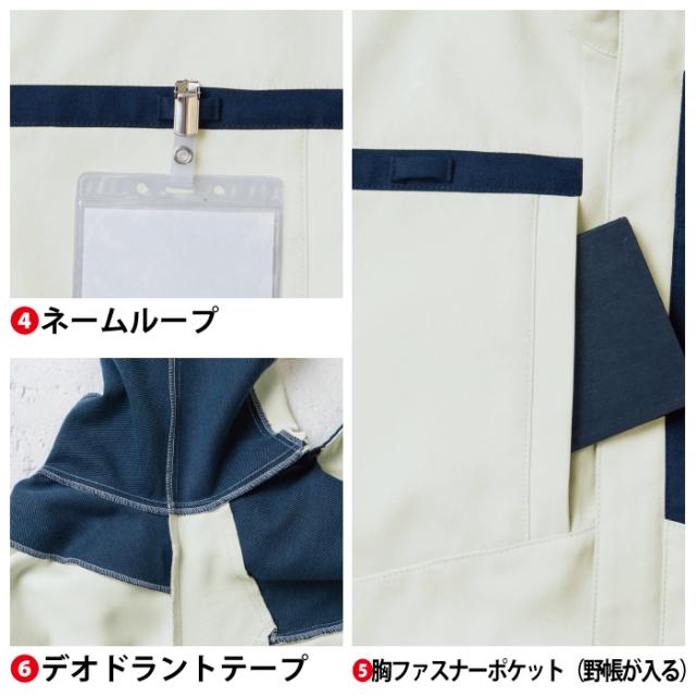 ◇機能:スタンドカラー・前立て・ドットボタン(隠し)・ネームループ・胸ファスナーポケット(野帳が入る)・脇ポケット・JIS制電ネーム・ノーフォーク・反射パイピング・袖ペン差し・胸ポケット・袖口ドットボタン(隠し)・JIS T8118規格適合