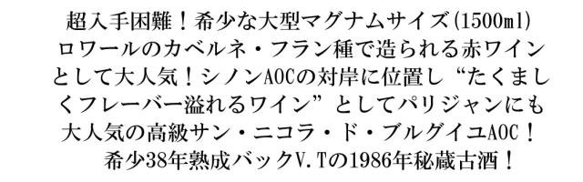 超入手困難!希少な大型マグナムサイズ(1500ml) ロワールのカベルネ・フラン種で造られる赤ワイン として大人気!シノンAOCの対岸に位置し“たくまし くフレーバー溢れるワイン”としてパリジャンにも 大人気の高級サン・ニコラ・ド・ブルグイユAOC! 希少38年熟成バックV.Tの1986年秘蔵古酒!