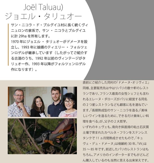【サン・ニコラ・ド・ブルグイユ村に長く続くヴィニュロンの家系で、サン・ニコラとブルグイユに計29haを所有します。1970年にジョエル・タリュオーがドメーヌを設立し、1993年に娘婿のティエリー・フォルツェンロゲルが継承しています(したがってご紹介する古酒のうち、1992年以前のヴィンテージがタリュオー作、1993年以降がフォルツェンロゲル作になります)。
