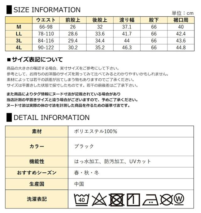 LL:ウエスト78-110 前股上28.6 後股上33.6 渡り幅41.7 股下66 裾口周42.4