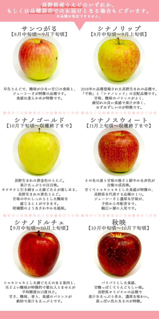 品種はサンつがる、シナノリップ、シナノゴールド、シナノスウィート、シナノドルチェのいずれか、もしくは品種混在でのお届けとなる場合もございます。