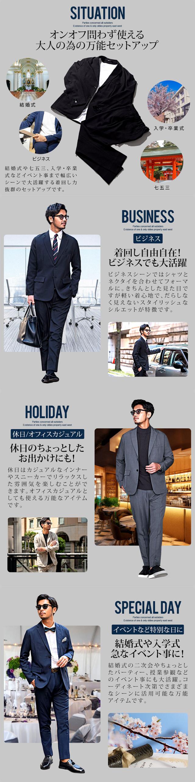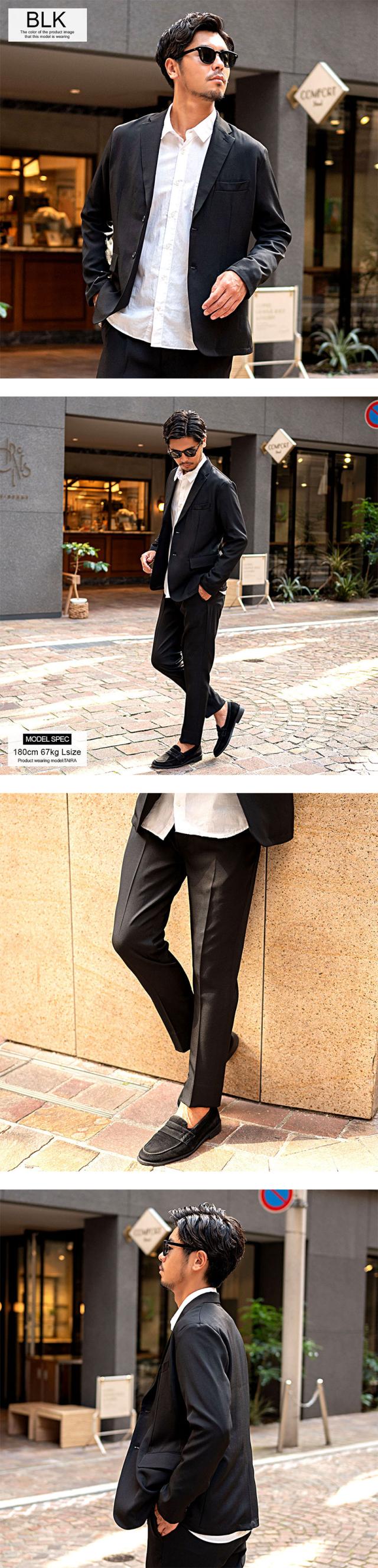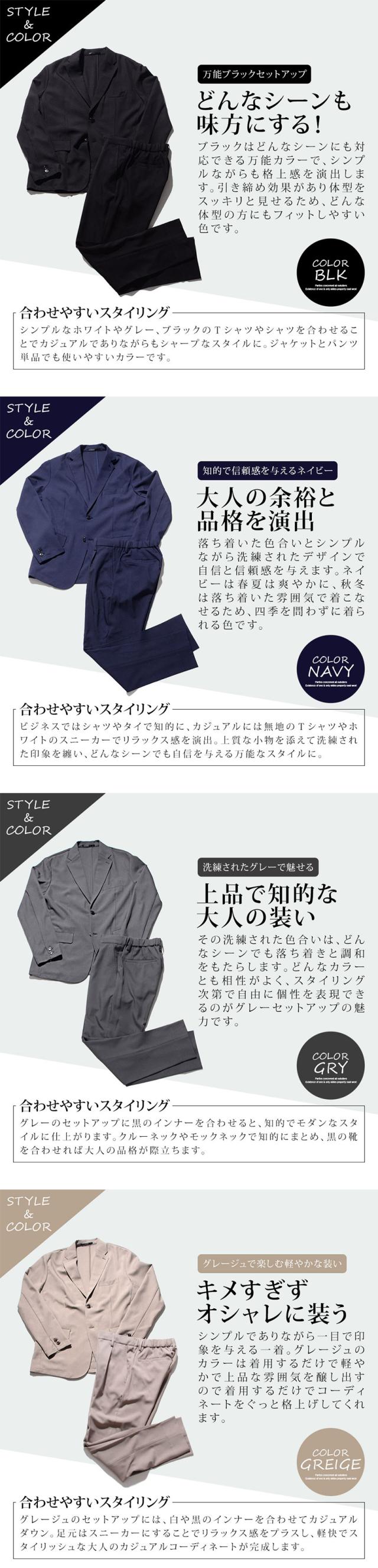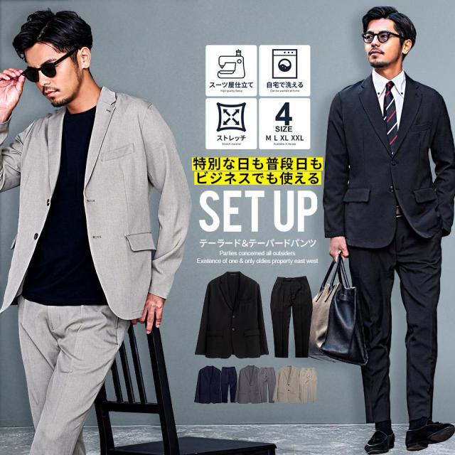セットアップ メンズ おしゃれ ストレッチ 伸縮 上下セット テーラードジャケット テーパードパンツ スラックス スーツ テイラードジャケット 細身 スリム タイト カジュアル きれいめ オフィスカジュアル ビジネス パーティ シンプル テレワーク リモートワーク 在宅勤務 ブラック ネイビー グレー グレージュ ベージュ 黒 紺 M L XL XXL LL 3L 春 夏 秋 冬 オールシーズン 無地 メンズファッション 男性 男 父の日 父の日ギフト 父の日プレゼント 20代 30代 40代 メンズファッション 東京 プレゼント 誕生日 記念日 贈り物 ギフト配送について