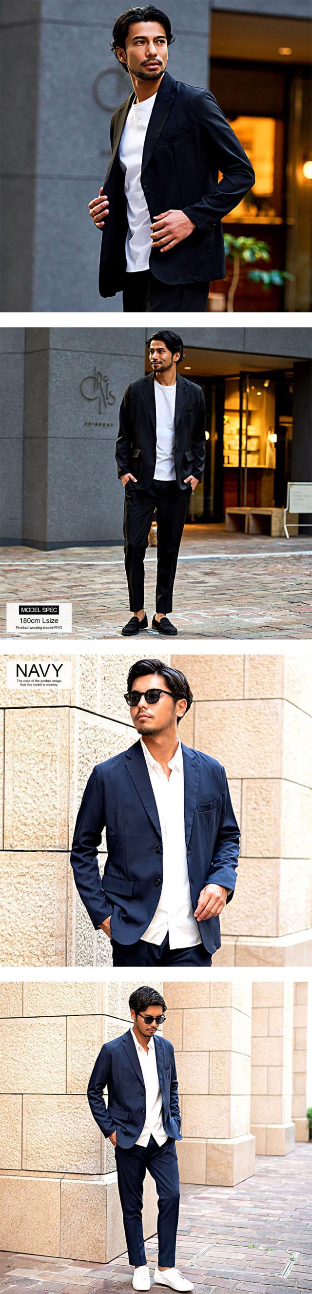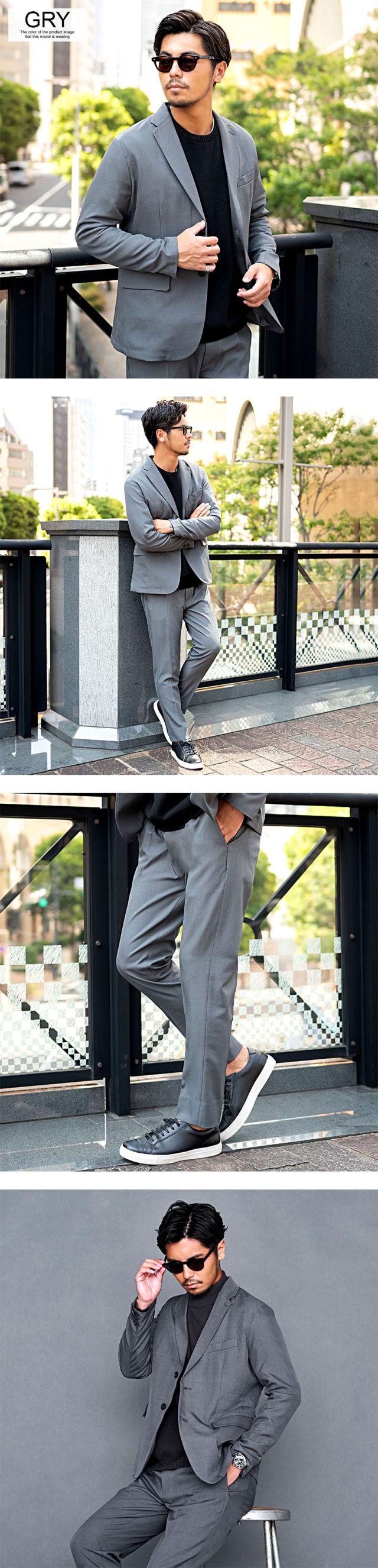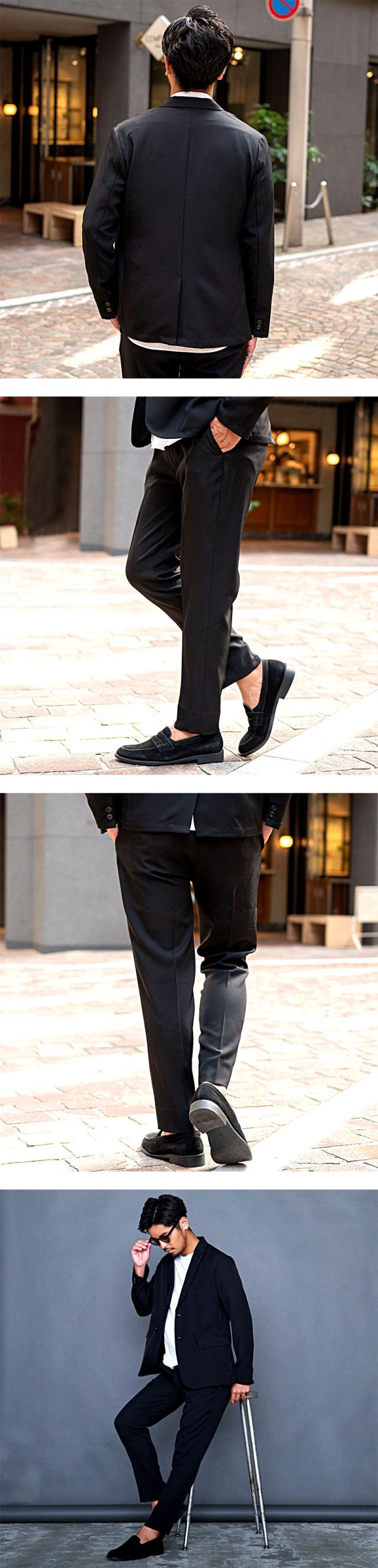 艶があり高級感溢れるストレッチ素材を使用したテーラードジャケットとテーパードパンツのセットアップ。