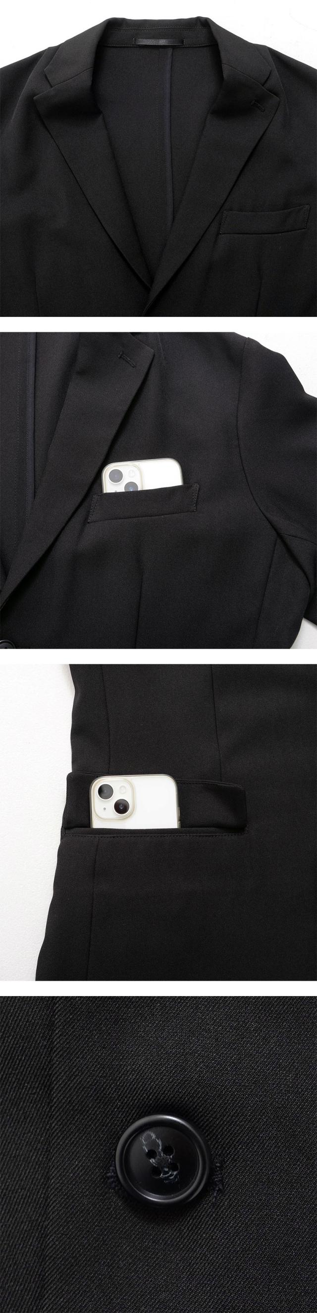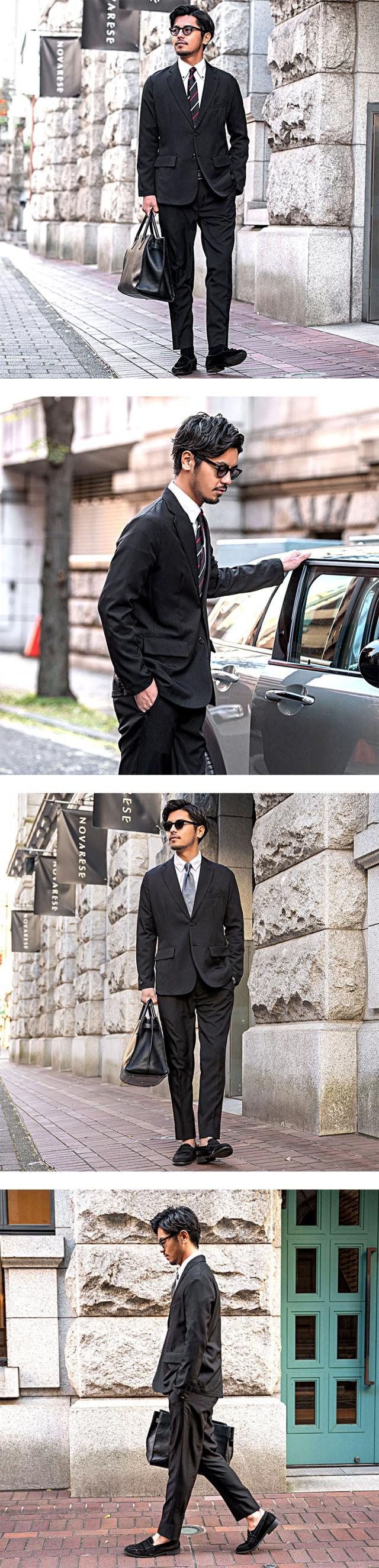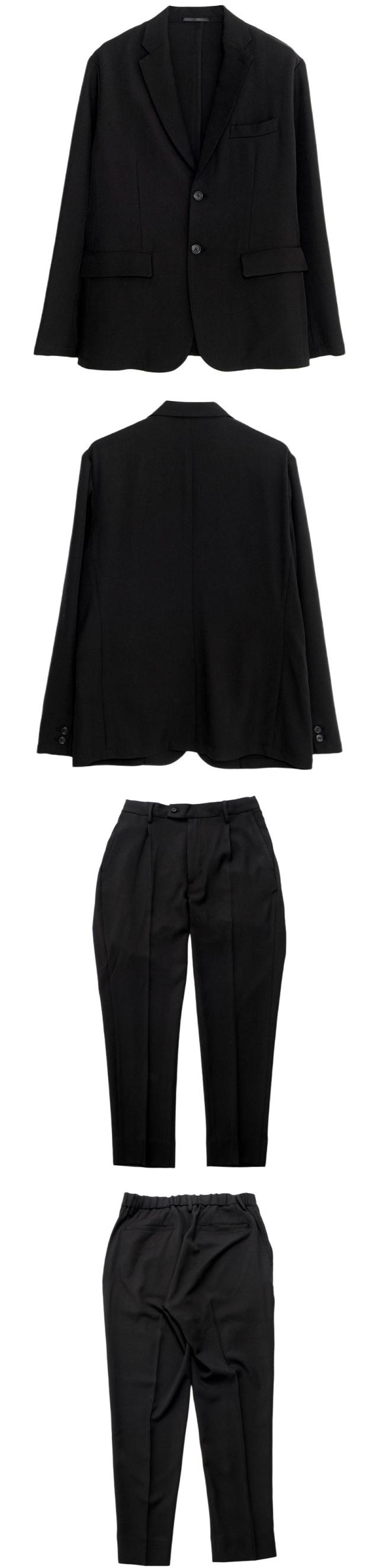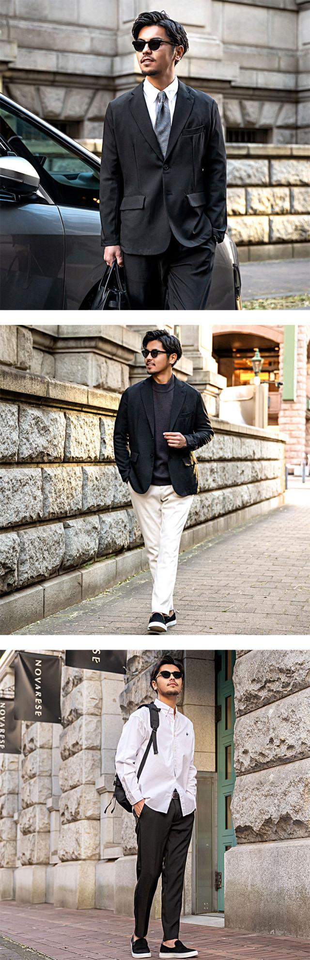 艶があり高級感溢れるストレッチ素材を使用したテーラードジャケットとテーパードパンツのセットアップ。