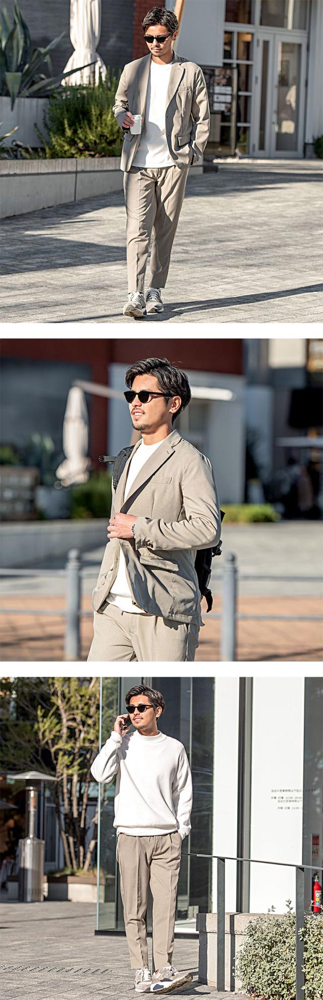 オールシーズン使えるこちらのセットアップは合わせるアイテムによってきれいめからカジュアルまで幅広いコーディネートを楽しめます。