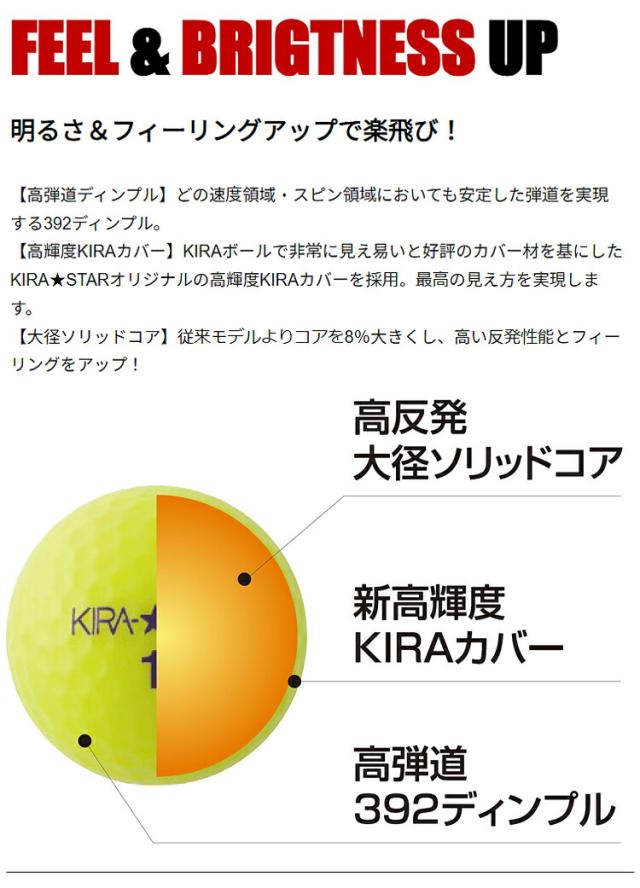 イエロー、オレンジ、ライム、ピンクの4色展開。仲間とそれぞれ異なったカラーでプレーを楽しむことで、ファストプレイにも役立ちます。 KIRAシリーズは、ターゲットごとに楽しいゴルフを提供する「KIRA Soft&Distant」「KIRA Ladies」「KIRA Spin」フラッグシップモデルの「KIRA KLENOT」などを展開。「KIRA★STAR」は、「見える」「飛ぶ」性能を受け継いだコストパフォーマンスに優れたモデルです。