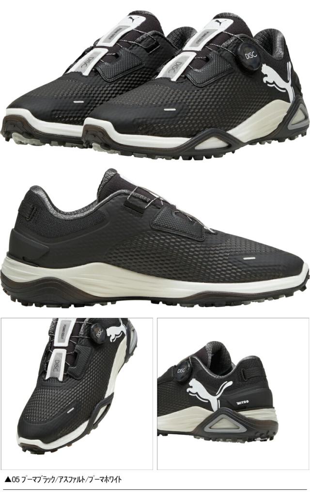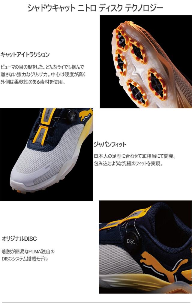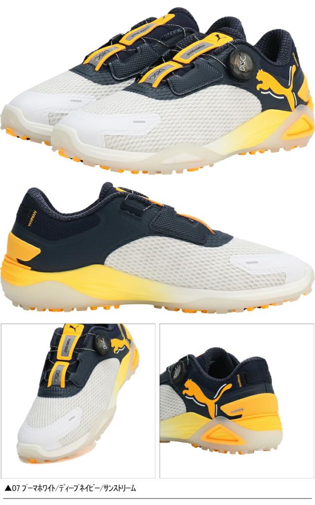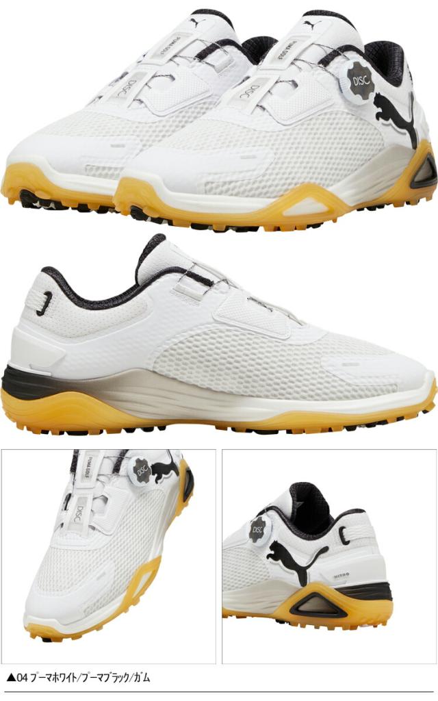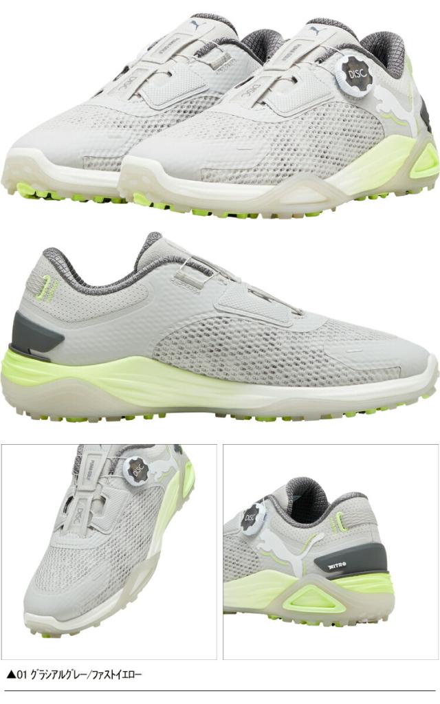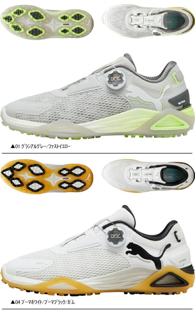 ミッドフォーム全体に NITRO フォームを搭載した新次元スパイクレスシューズ。CATEYEトラクションで様々なライでもしっかり捕らえる新アウトソール構造。地面反力を効果的に利用し、飛距離アップが期待できる。PUMA独自のディスククロージャーシステムにより容易に着脱が可能
