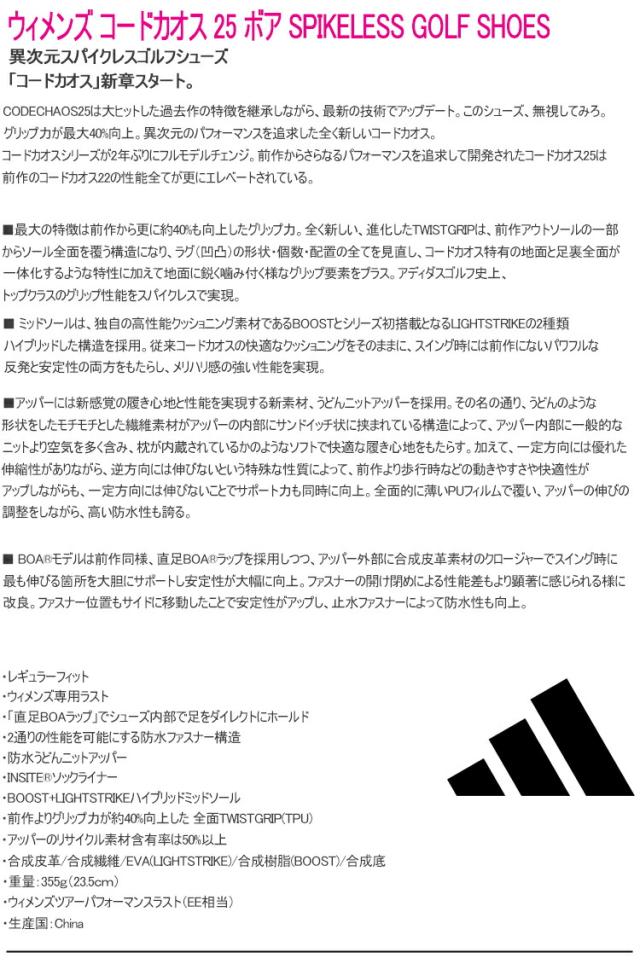 アディダス コードカオス 25 ボア スパイクレス ウィメンズ ゴルフシューズ 「Adidas COEDCHAOS 25 BOA SPIKELESS GOLF SHOES」NKZ95 2024年秋冬モデル日本正規品