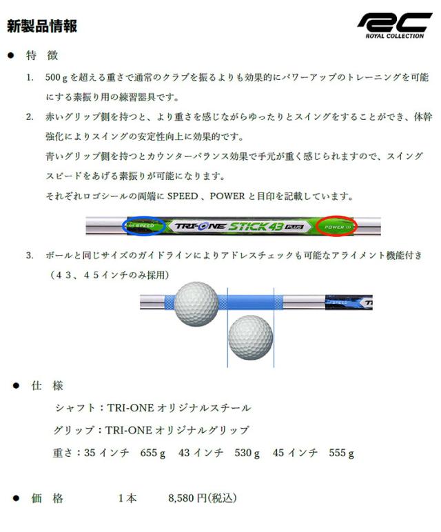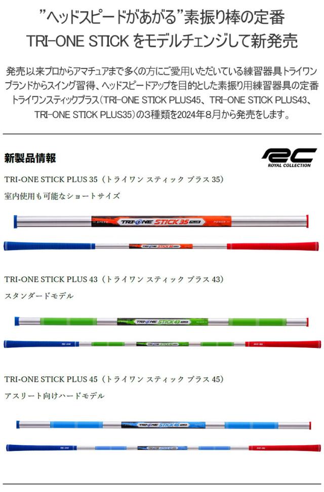 株式会社ロイヤルコレクション(代表取締役:岩崎暁展/所在地:東京都立川市)は、発売以来プロからアマチュアまで多くの方にご愛用いただいている練習器具トライワンブランドからスイング習得、ヘッドスピードアップを目的とした素振り用練習器具の定番トライワンスティックプラス(TRI-ONE STICK PLUS45、 TRI-ONE STICK PLUS43、TRI-ONE STICK PLUS35)の3種類を2024年8月から発売をします。