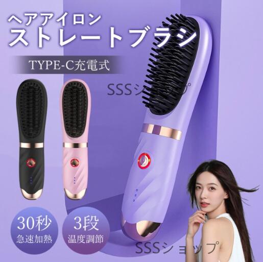 ヘアアイロン ストレートアイロン ヘアアイロンブラシ コードレス ヒートブラシ USB充電式 携帯用 ブラシ 3段階温度調整 急速