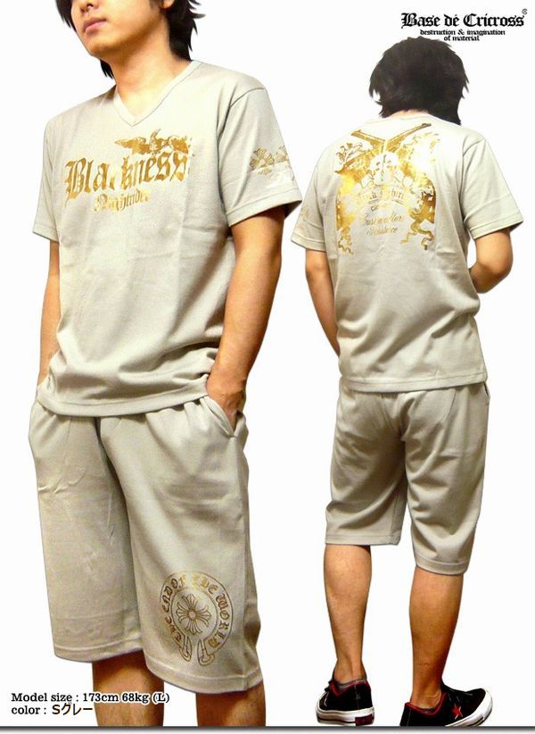 ★ラグジュアリーな金箔プリントが多数入った悪羅悪羅(オラオラ)系メンズ上下セットアップ半袖VネックTシャツ&ハーフパンツ!パンツはゴムウエストで穿き易く上下ともに日本製で高品質!部屋着からスポーツやジムウェア、ダンサーの衣装にまで使い勝手抜群の夏場に大活躍しそうなセットアップTシャツです!