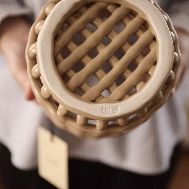 伝統的なバスケットの編み目を陶器で再現したハンドメイドの小物入れです。
