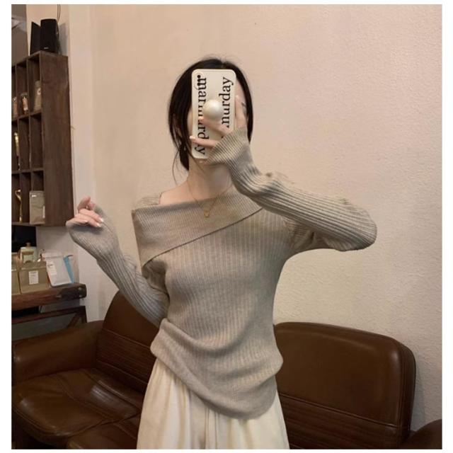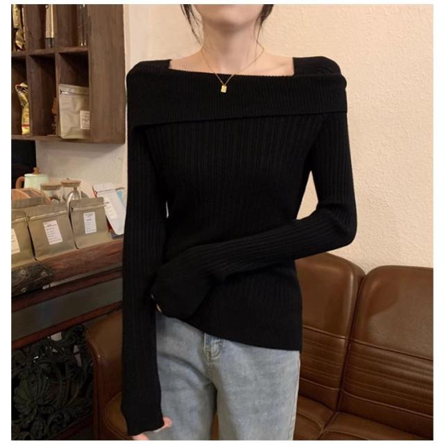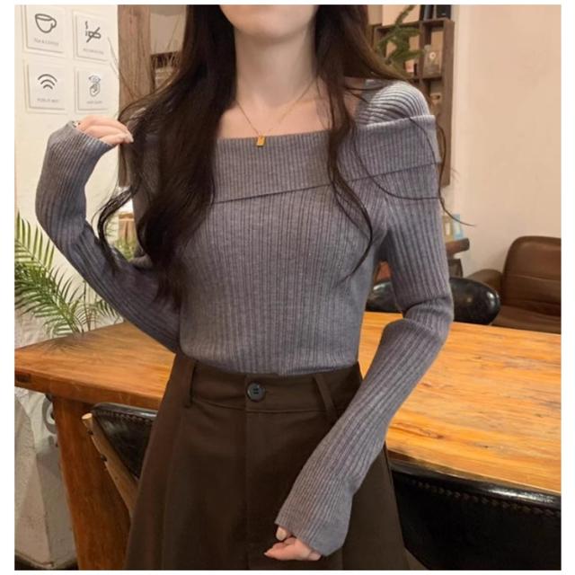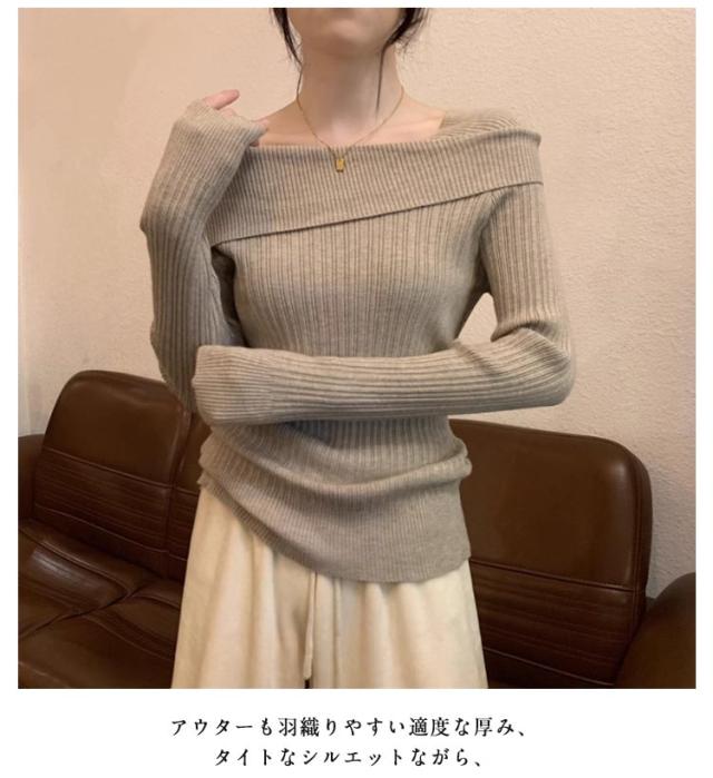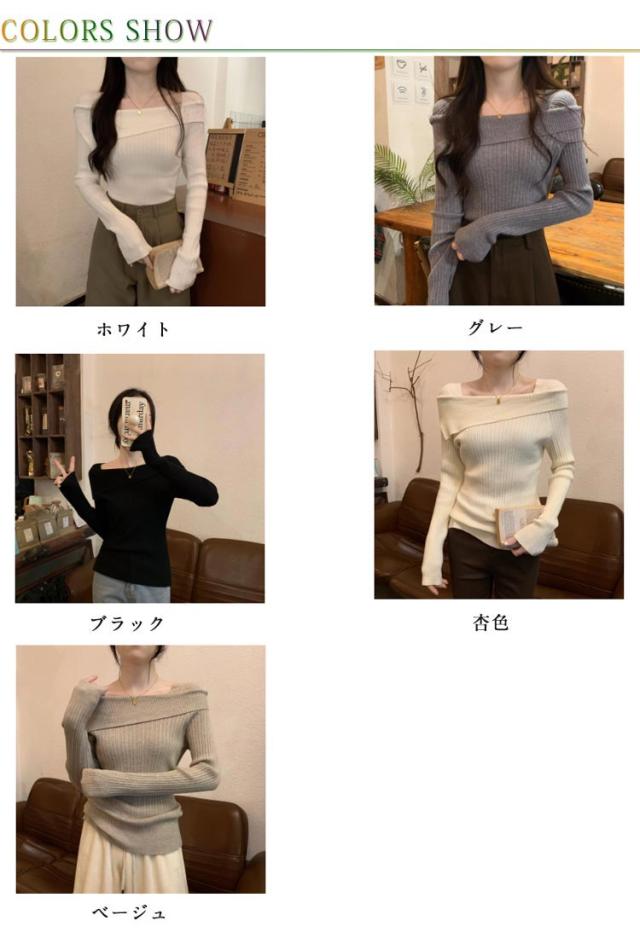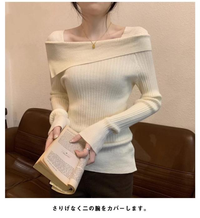 ワンショル風 春秋 長袖 ニットセーター オフショルダー ニットセーター スクエアネック トップス セーター リブニット タイト 着痩せ 二の腕隠し お洒落 セクシー キレイめ 無地 オフィス 通勤 韓国ファッション