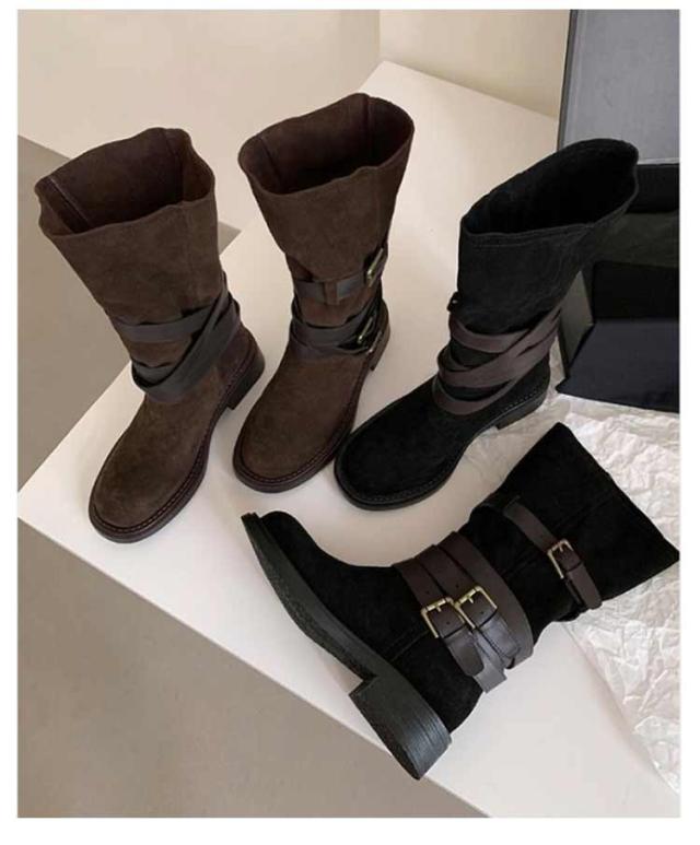 | レトロ風、豊富なベルトデザインが存在感を出し、 コーデのアクセントになるミドルブーツ。 履くだけでスマートな着こなしに! ショートパンツ/スカートなとボトムと好相性です。 | |