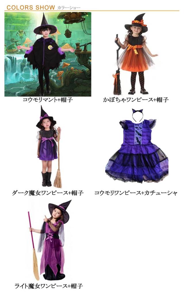 | 色 | コウモリマント+帽子 かぼちゃワンピース+帽子 ダーク魔女ワンピース+帽子 コウモリワンピース+カチューシャ ライト魔女ワンピース+帽子 |