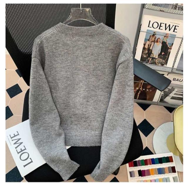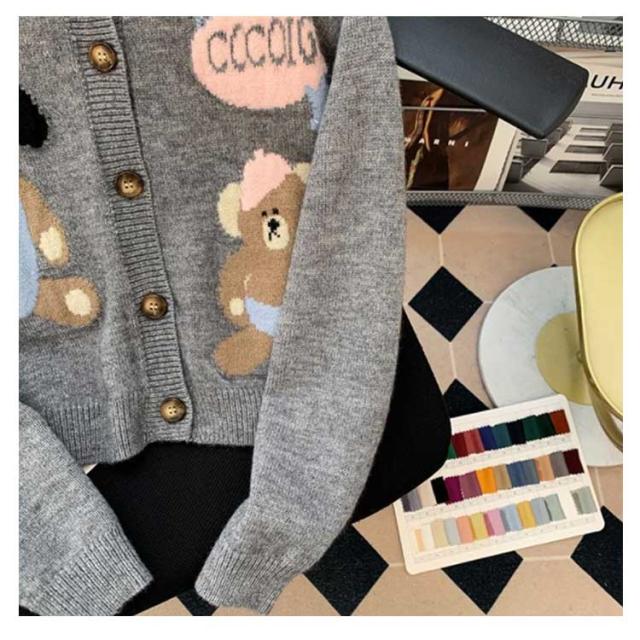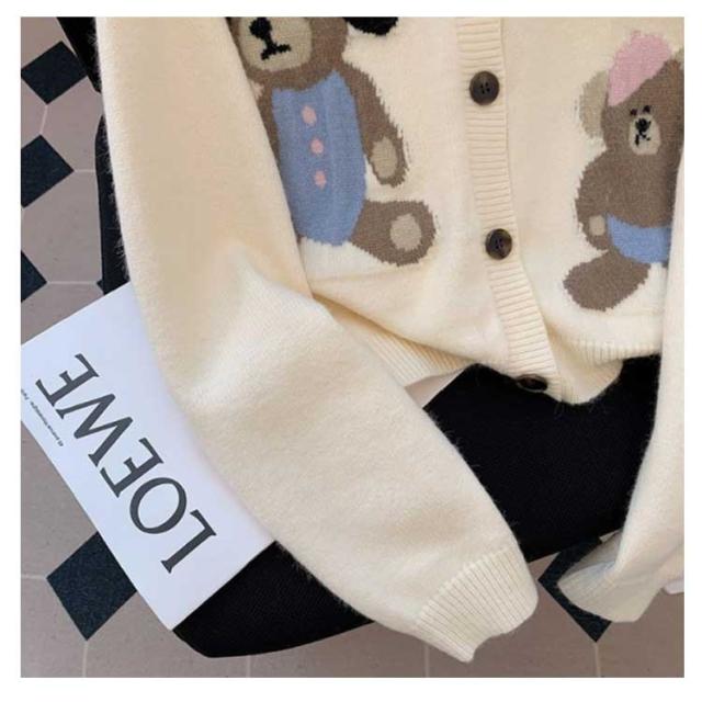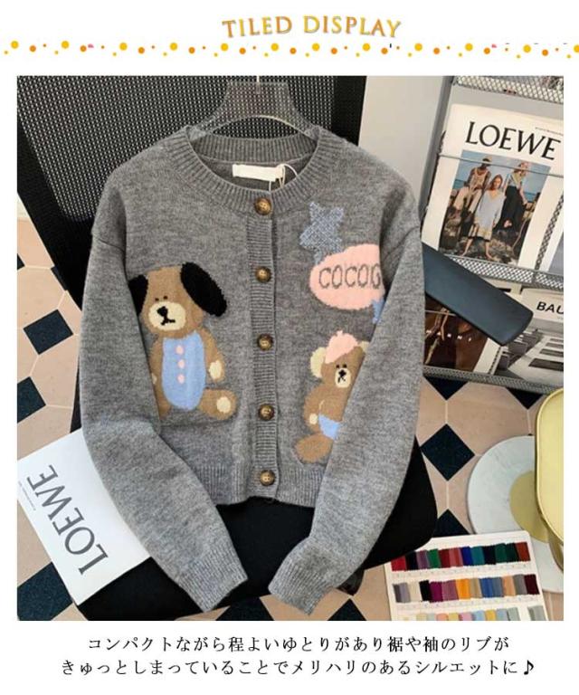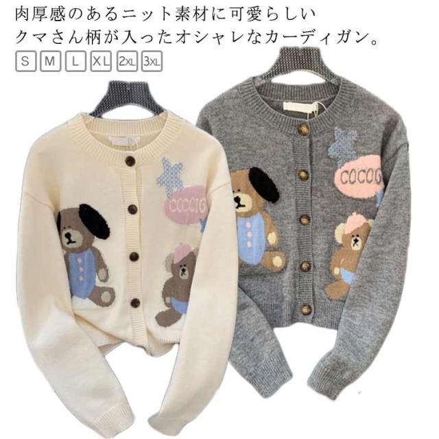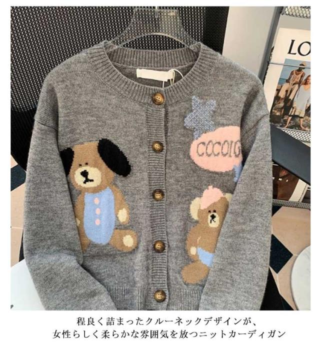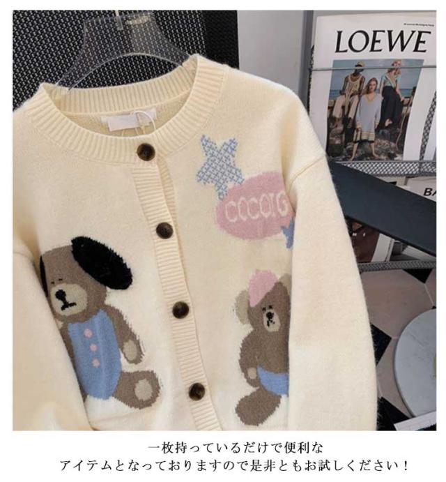ニットカーディガン クルーネック 熊柄 ニットカーディガン トップス レディース 秋 冬 長袖 カーディガン カーデ 羽織り 丸首 可愛い ニット ショート丈 厚手 あったか 秋アウター 学生 女子 大人 ゆったり 秋物 秋服 ニットトップス