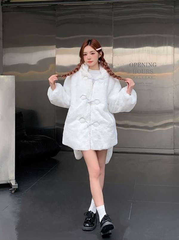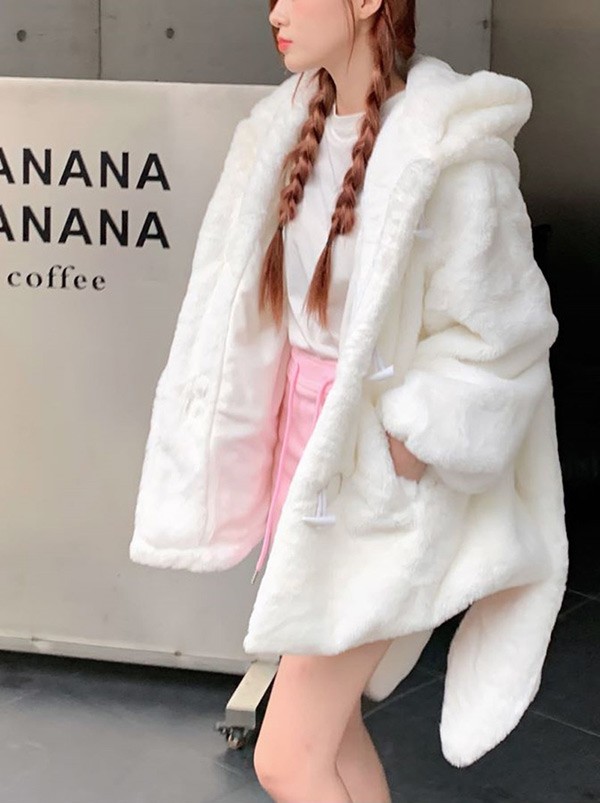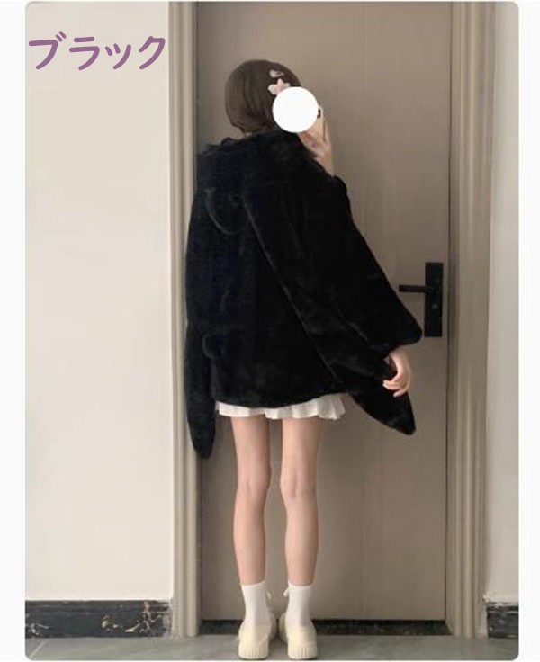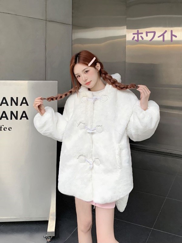 ダッフルコート アウター 兎耳 レディース もこもこ ショート丈 コート 無地 防寒 かわいい 長袖 ロリータ 前開き フード付き うさ耳 ふわふわ 冬 キュート カジュアル 体型カバー 白 黒