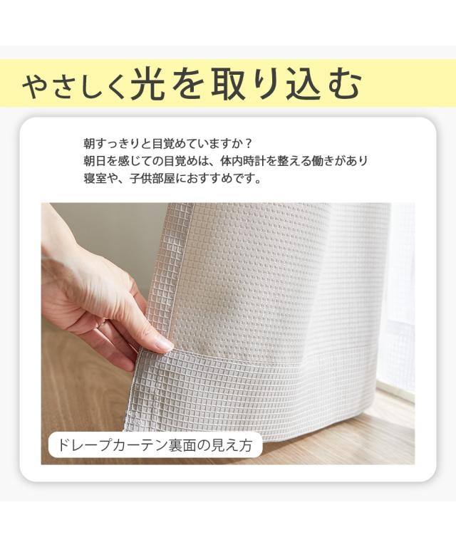 豊富な12色から選べる 。お買い得なカーテンです。 カーテンの表面に凹凸感のあるワッフル生地を使用しているので、おしゃれで表情のある空間にしてくれます。 淡いくすみカラーからビビットなカラーまで取り揃えていますので、カーテン次第でお好きなお部屋作りをお楽しみいただけます。 生地感にこだわりつつも、やはり、お買い得価格に一番こだわりました。リビングはもちろん、寝室や子供部屋にもおすすめです。 新生活をする方や模様替えで気分を変えたい方、やわらかな光を取り入れたい方、ぜひ、こちらのカーテンをお試しください 。 ■機能 なし ■おすすめポイント・特徴 洗濯機OK(ネット使用) ■こんなお部屋におすすめ 太陽の光を採り入れたいお部屋 ■こんな方におすすめ 朝すっきり目覚めたい方 ■ブランド ニッセンオリジナル