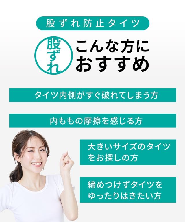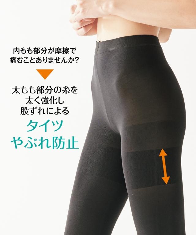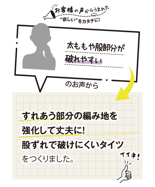 お客様の声から生まれた股ずれ部分が破れにくいすごのび80デニールタイツ 【生地強化×大きなサイズ】 「ほしい」を「カタチ」に。 お客様が実際に着用して、気になった所、ご要望を元に 商品を繰り返し【改善】 お客様と一緒に商品を育てました! こんな方にオススメ!「タイツ内側がすぐ破れてしまう方」「内ももの摩擦を感じる方」「大きいサイズのタイツをお探しの方」「締め付けずタイツをゆったりはきたい方」 股上サイズを見直しました! パンティ部分の股上の深さを長くして、ウエスト部分のズレを改善しました。 破けにくい!「太ももや股部分が破れやすい…」のお声から すれあう部分の編み地を強化して丈夫に! またずれで破けにくいタイツを作りました。