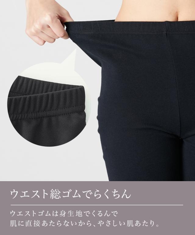 ウエストゴムは身生地でくるんで肌に直接たらないから、やさしい肌あたり。