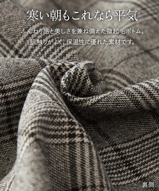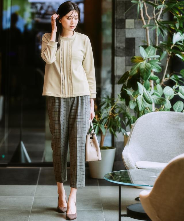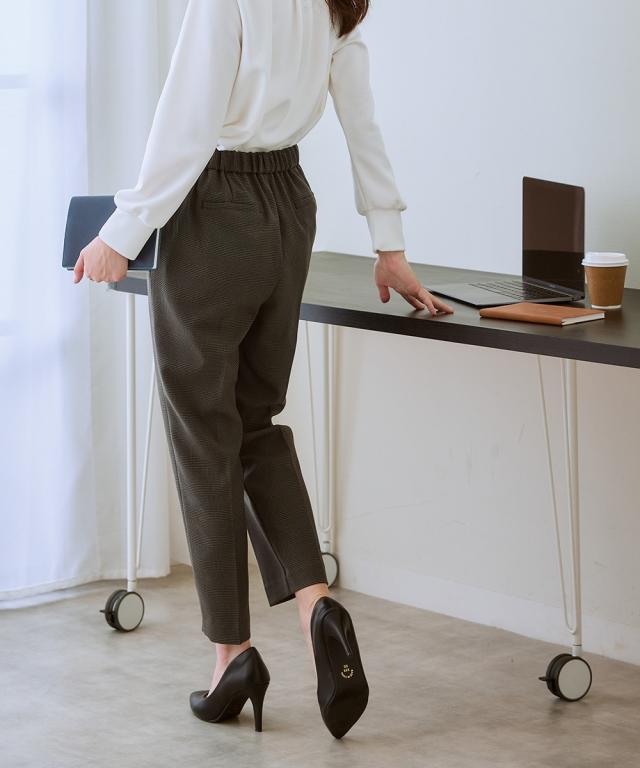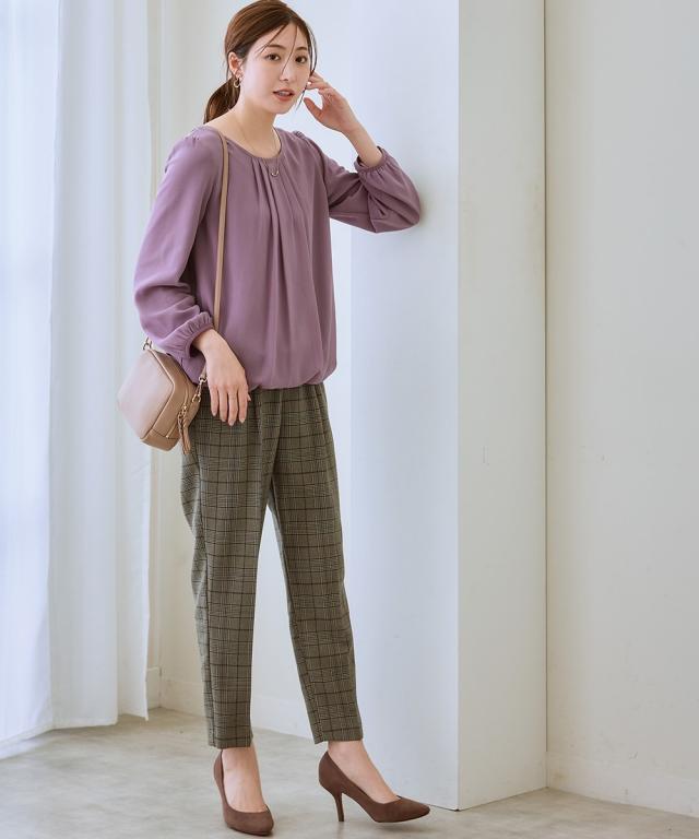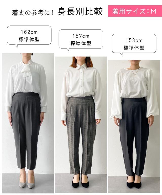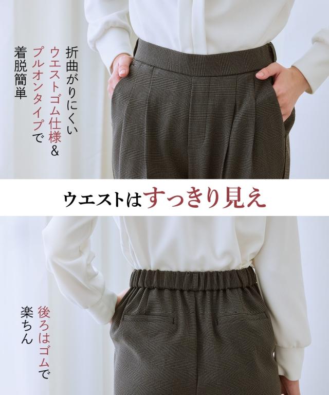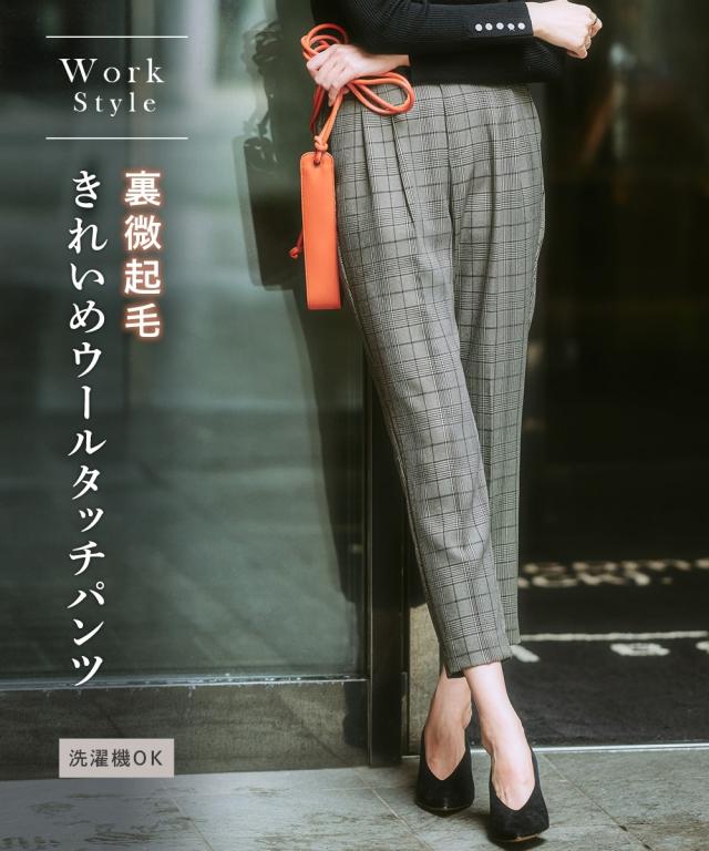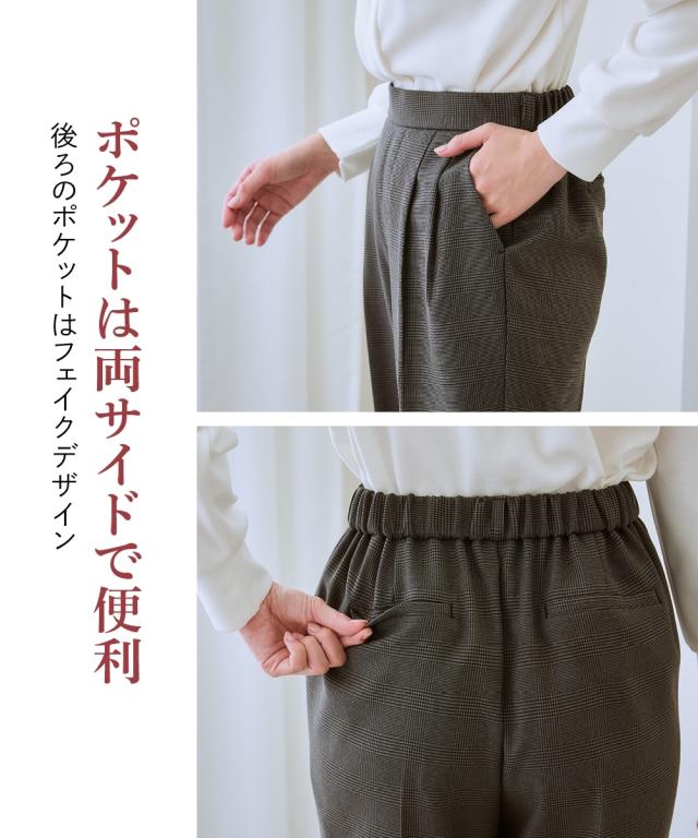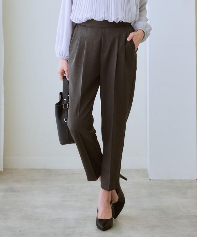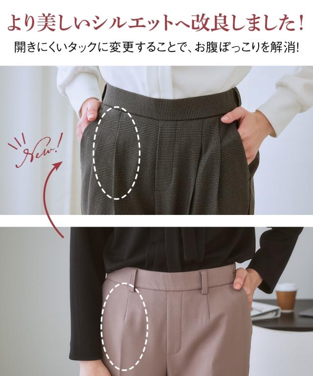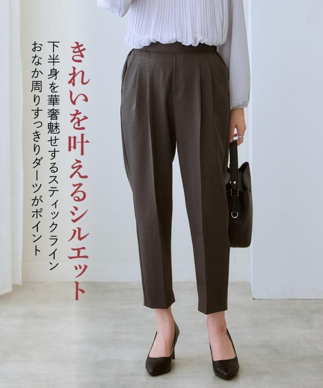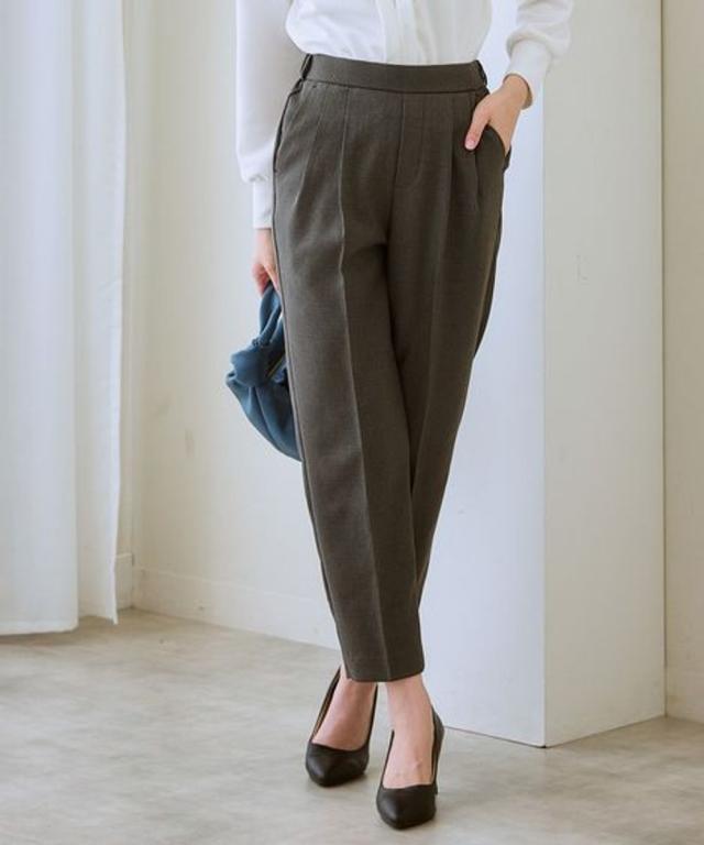 【お腹がぽっこりして見えないウール調テーパードパンツ】誰が履いてもすっきり美しいシルエットに見えるディテール入り。着膨れしやすい季節にきれいにあたたかく履ける1本。■デザイン プルオンのテーパードパンツ、フロントタック部分はおなか部分は開かないよう縫い合わせた仕様になっているのでさりげなく体型カバーできる仕様になっています。全体に少しゆったり目なので体型を選ばず使いやすいデザイン。ウエストゴム仕様でらくちん。■素材 表側は通勤仕様のキレイ見え素材。裏側は着用時にヒヤッとしないように起毛をかいた裏微起毛仕様。着ぶくれしにくく布帛なのでカジュアル見えしにくくお仕事にもおすすめ。 ■おすすめスタイリング おなかすっきりなのでカーディガンやブラウストップスをインしてスタイルアップさせるのもおすすめ。 〜7days Life Styling〜仕事の日、休日、イベントの日まで、 働く女性の毎日を商品やコンテンツを通して、 自分らしく快適でいられる“働く服改革”をサポートします。