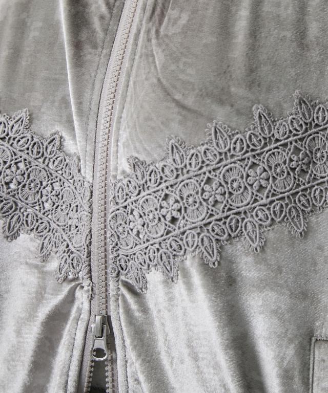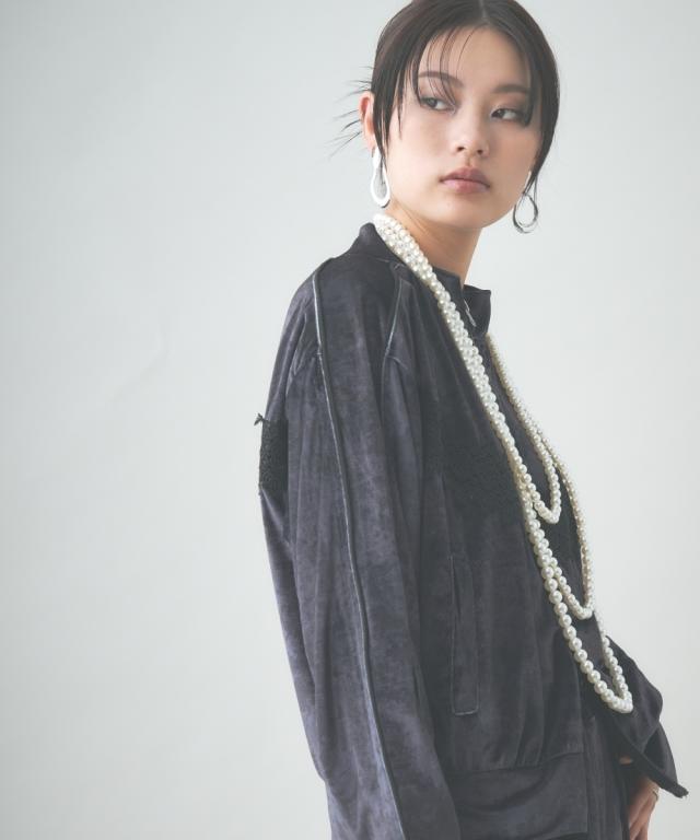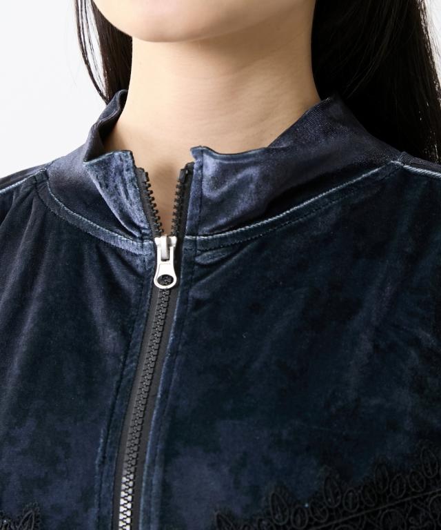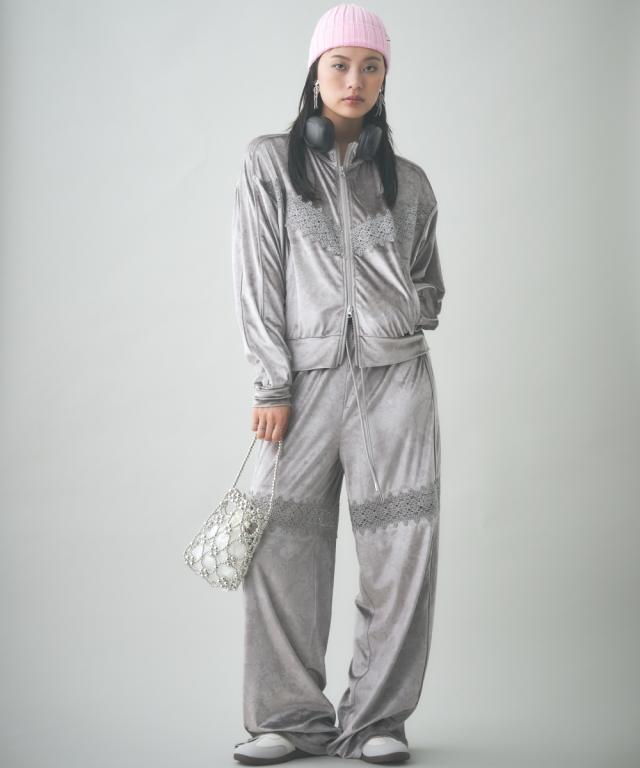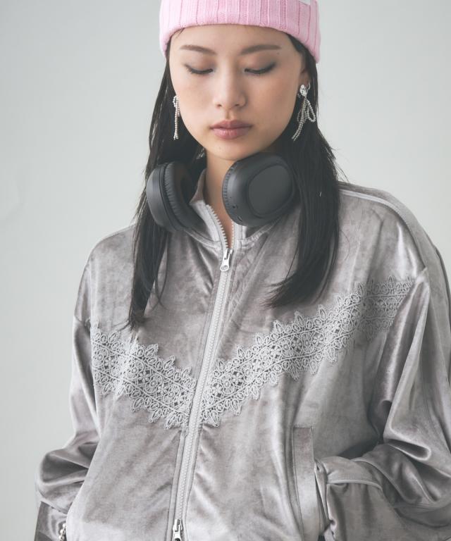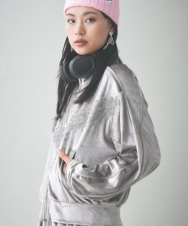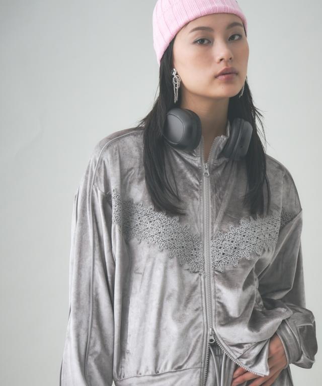 光沢のあるベロア素材にデジカモプリントを施したトラックジャケット。レースをドッキングしてガーリー要素をプラス。着こなしの幅が広がるスタンドネックのダブルジップデザイン。同素材のトラックパンツとのセットアップスタイルもおすすめです。