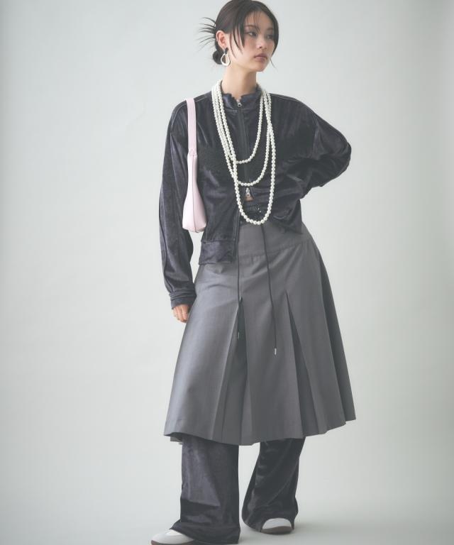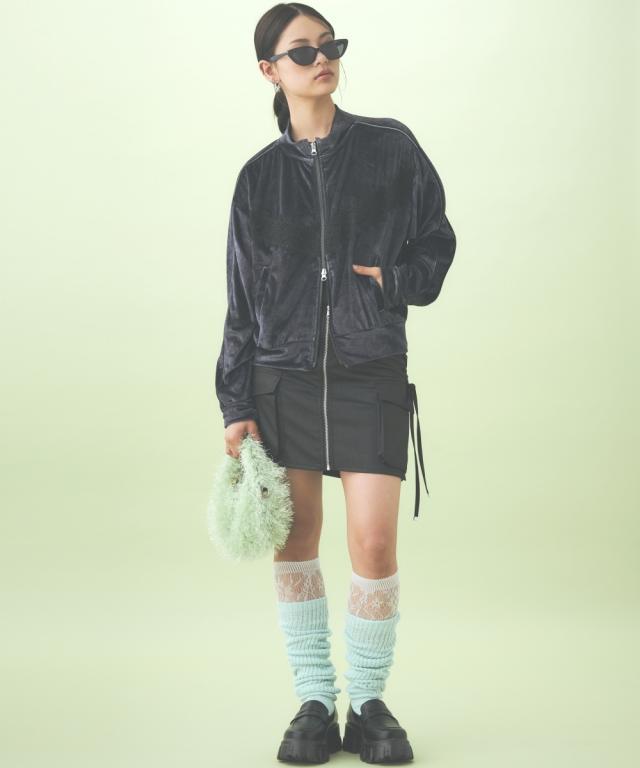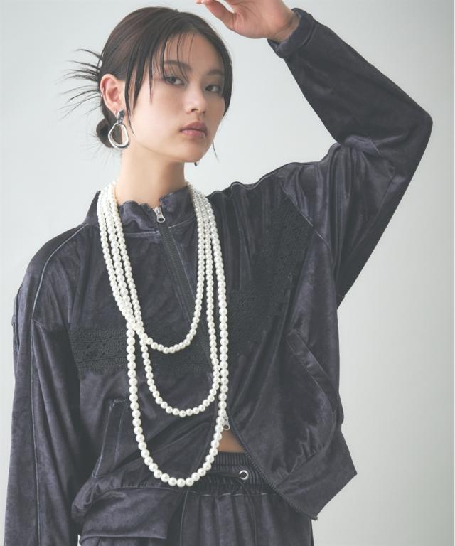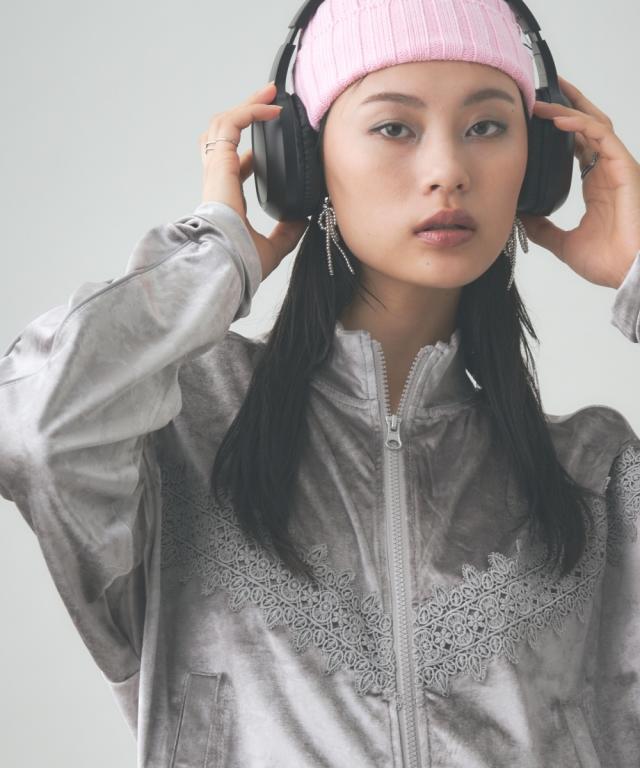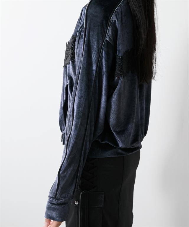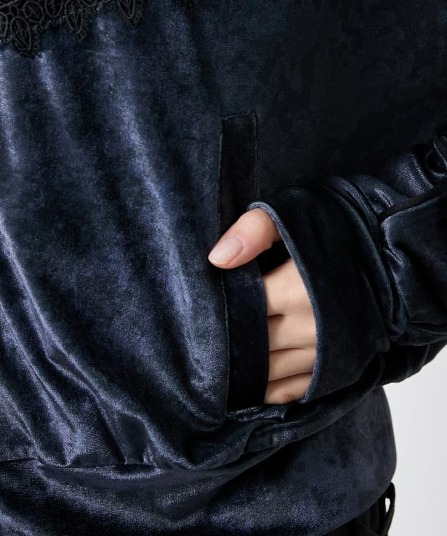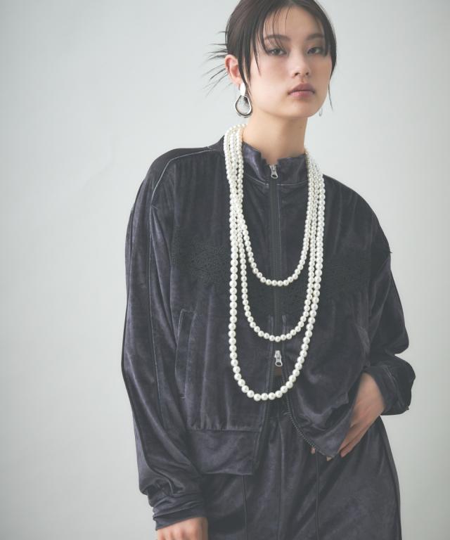 光沢のあるベロア素材にデジカモプリントを施したトラックジャケット。レースをドッキングしてガーリー要素をプラス。着こなしの幅が広がるスタンドネックのダブルジップデザイン。同素材のトラックパンツとのセットアップスタイルもおすすめです。