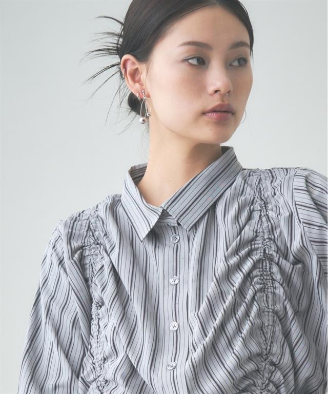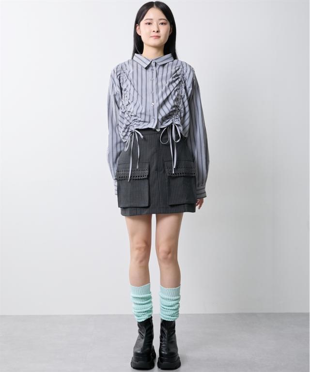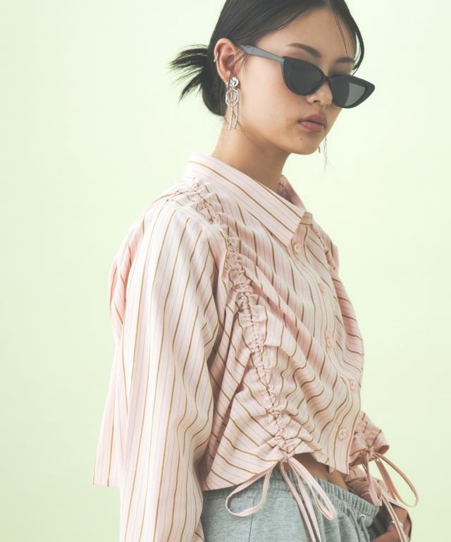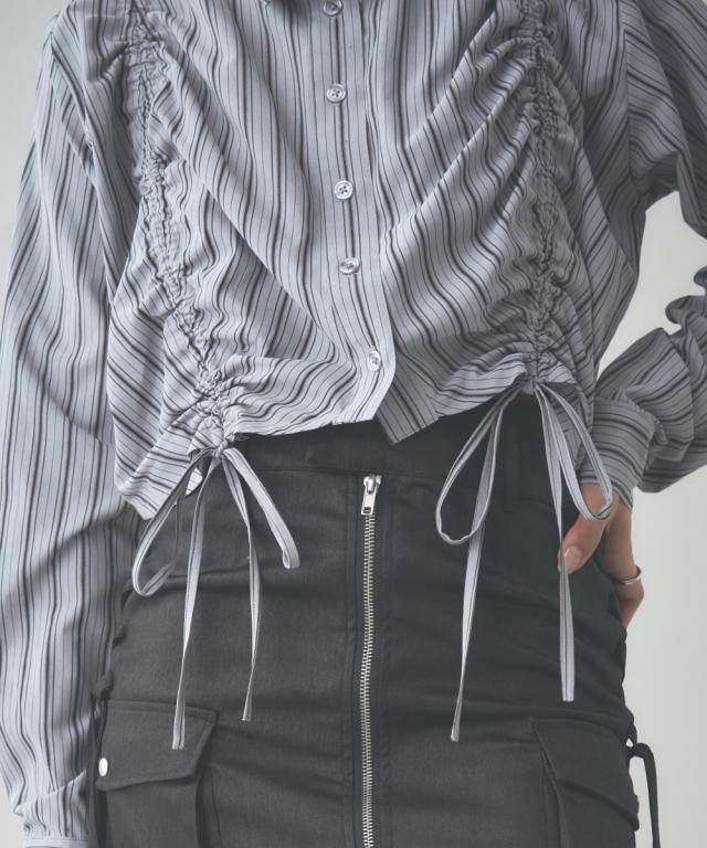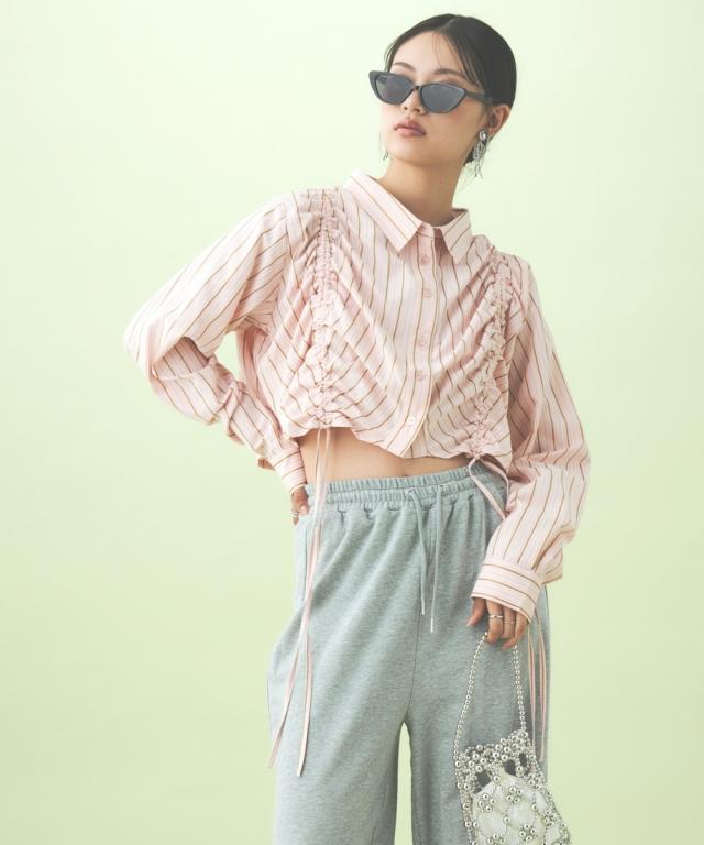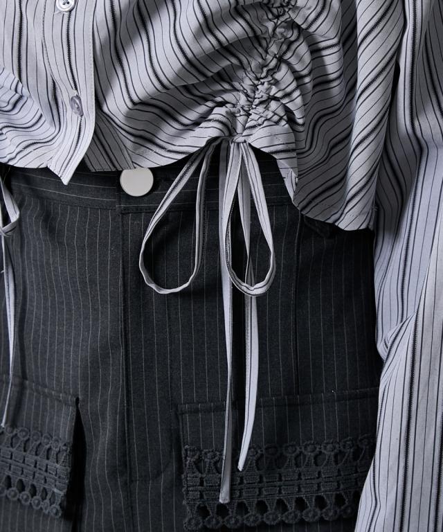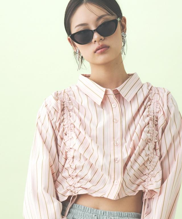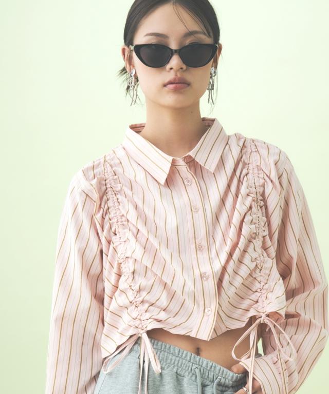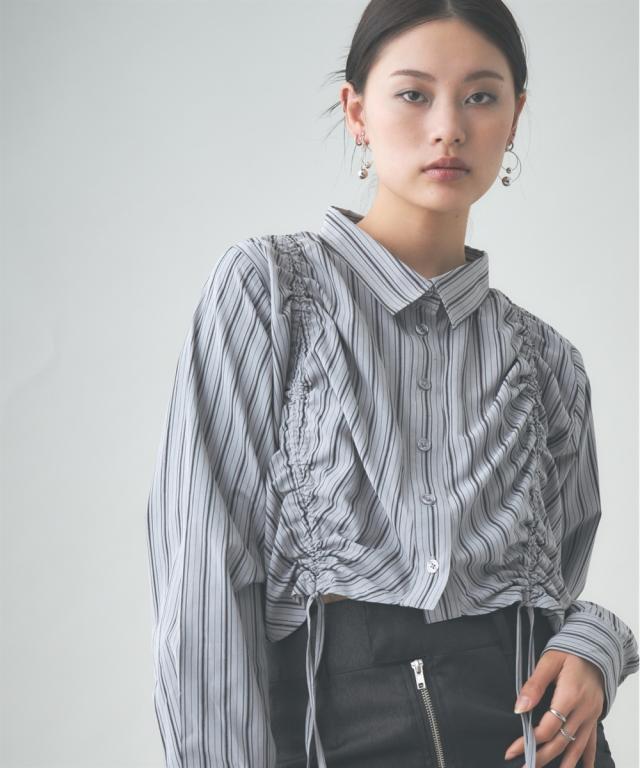 メンズライクなシャツをクロップド丈にアレンジ。フロントのドロストデザインが特徴的な、トレンドのストライプシャツ。ボリュームのあるボトムスのコーデがおすすめです。