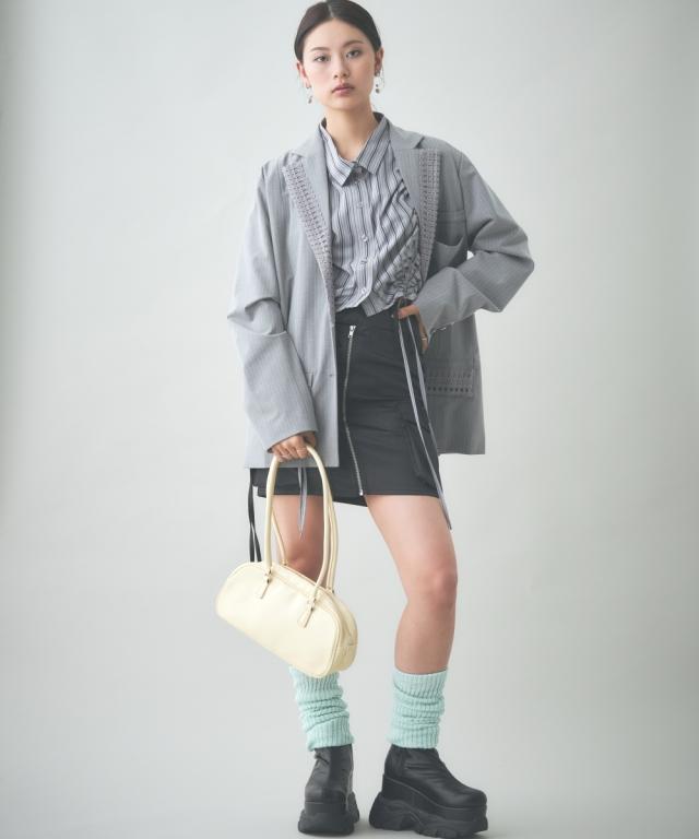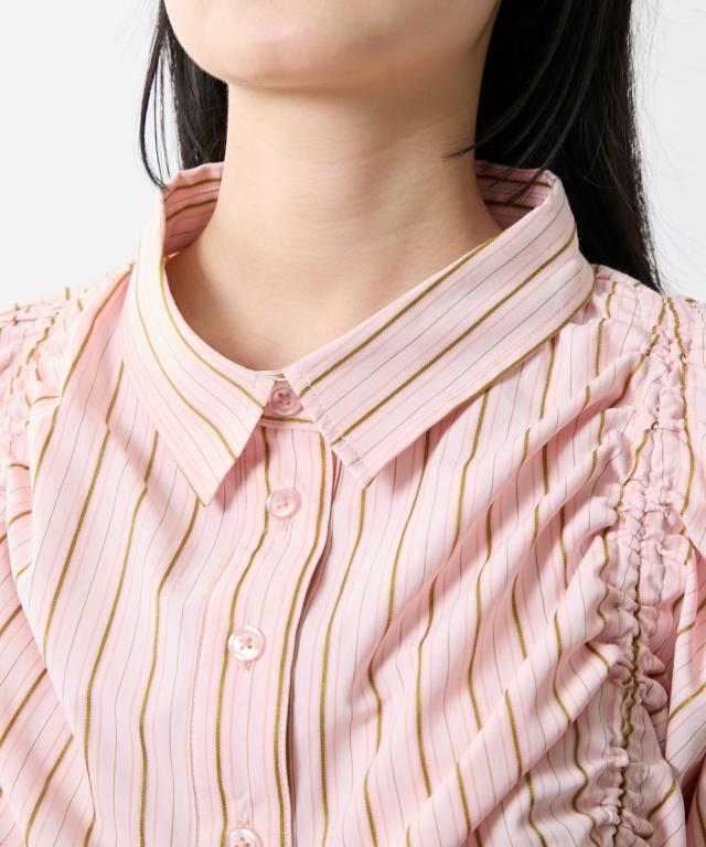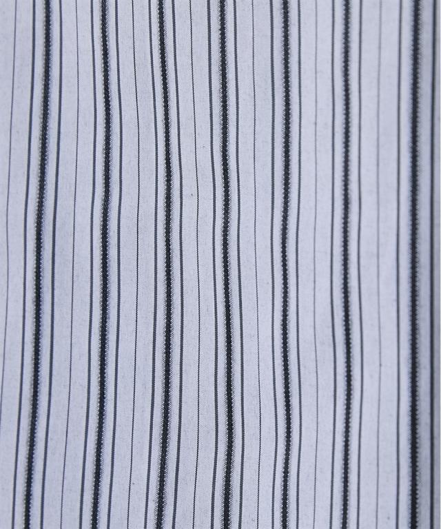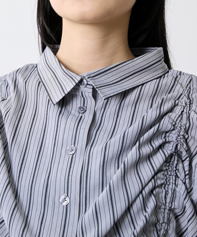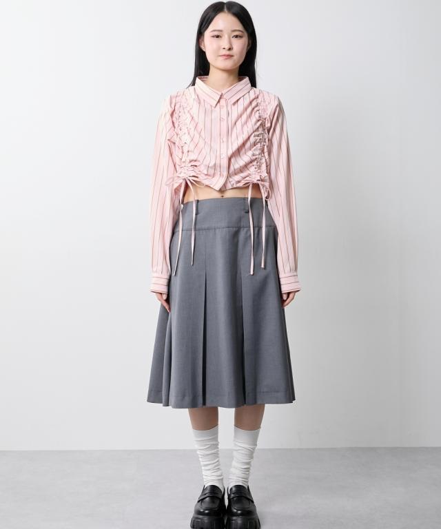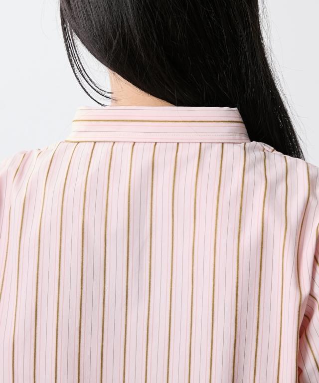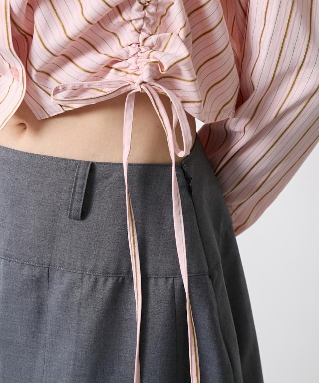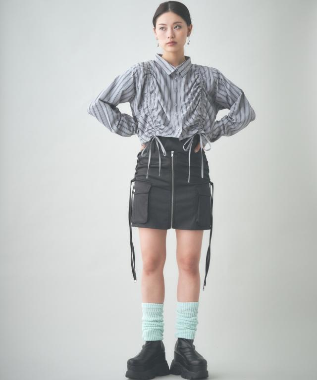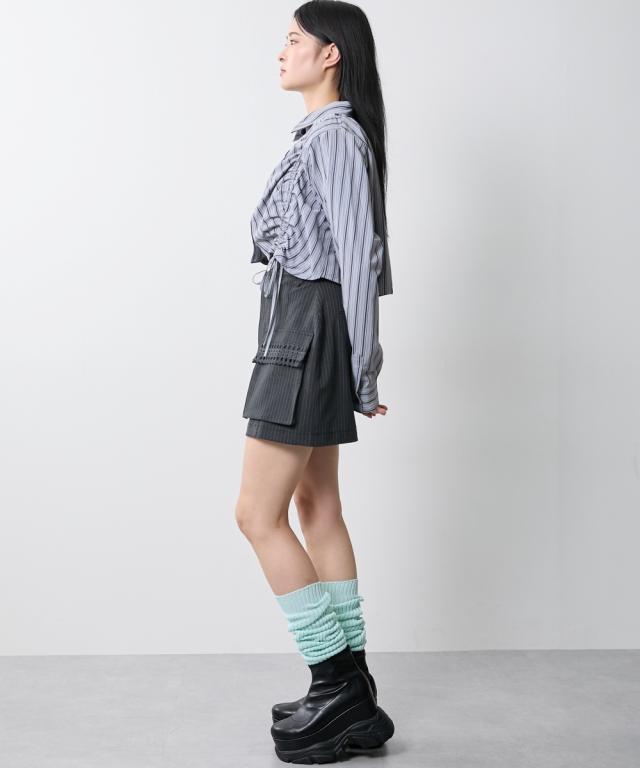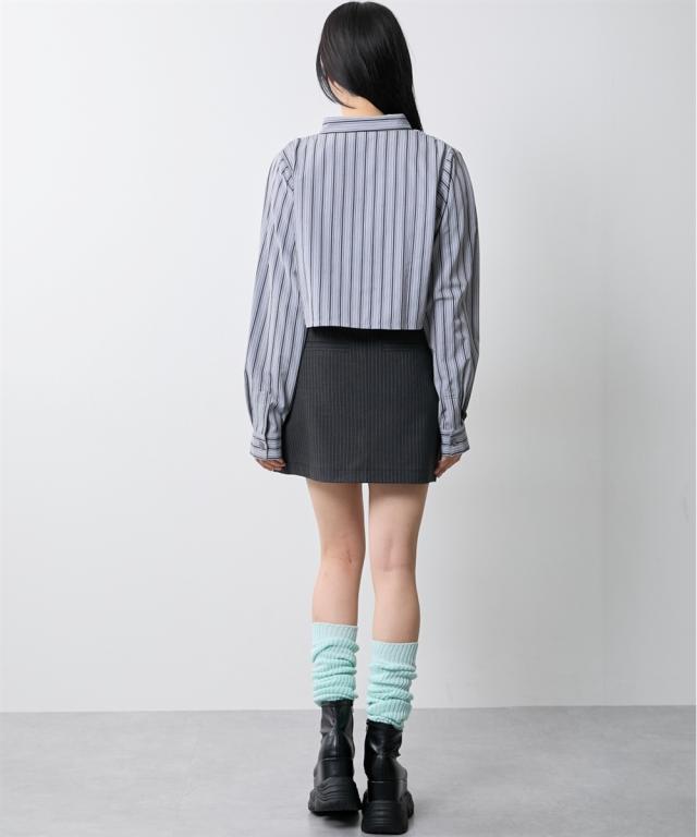 メンズライクなシャツをクロップド丈にアレンジ。フロントのドロストデザインが特徴的な、トレンドのストライプシャツ。ボリュームのあるボトムスのコーデがおすすめです。