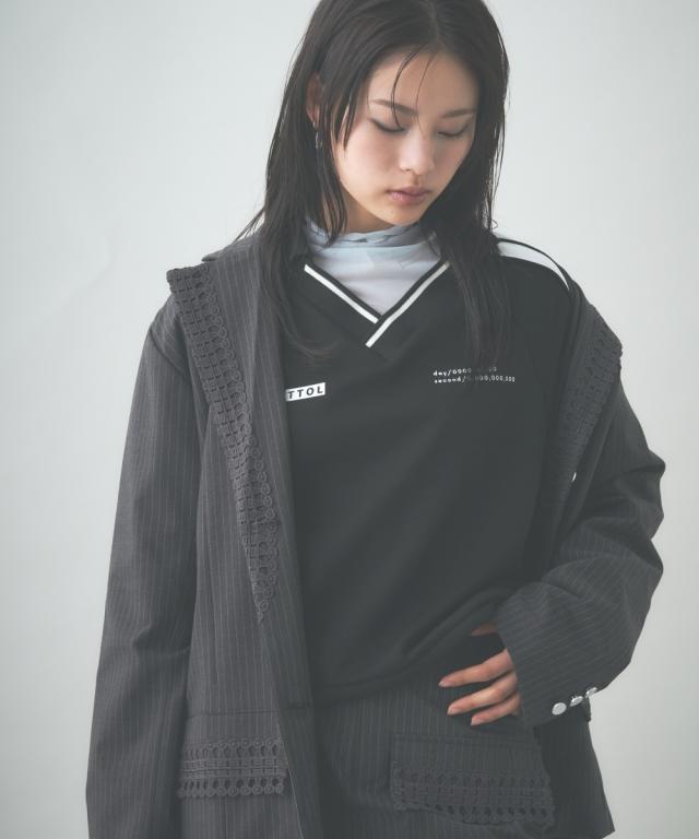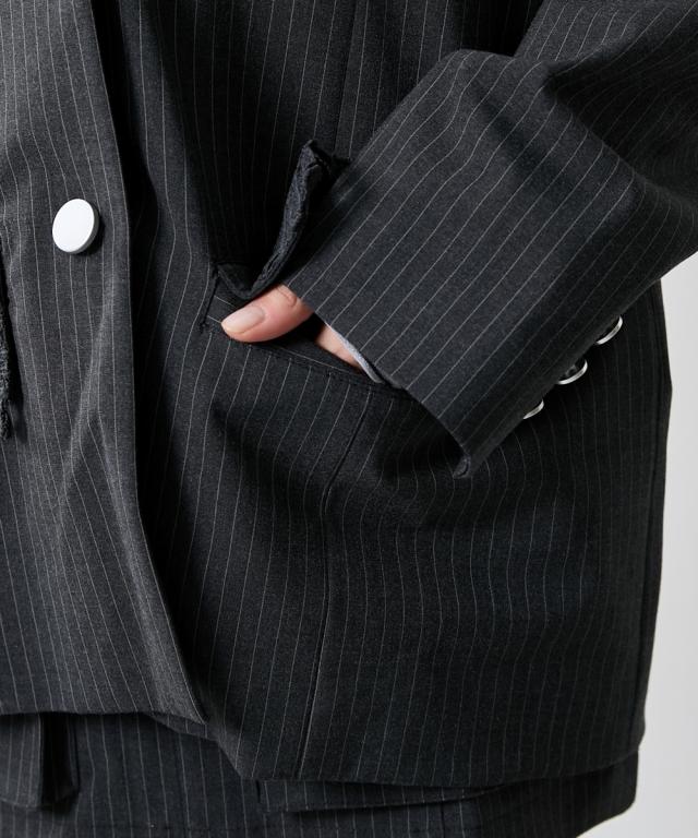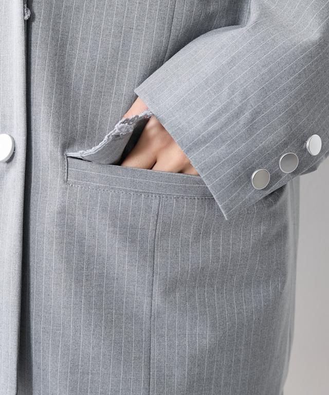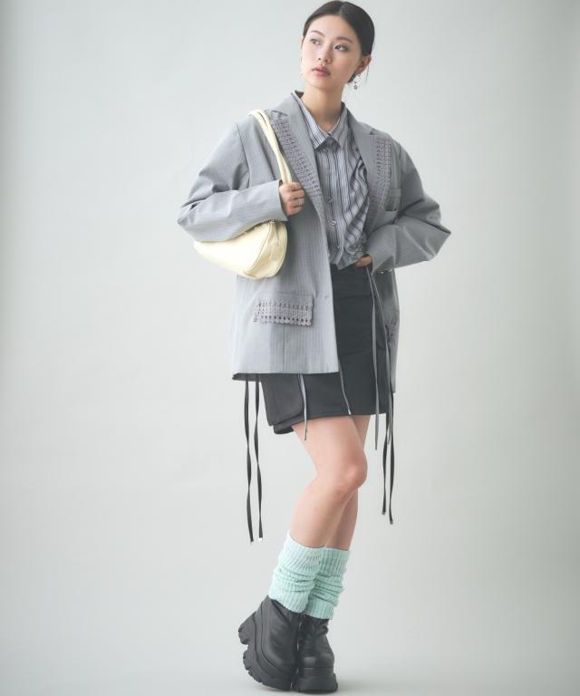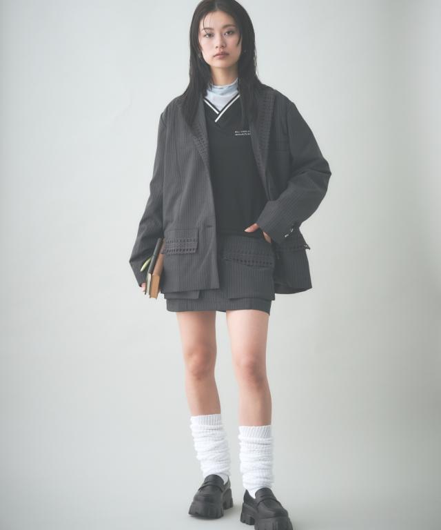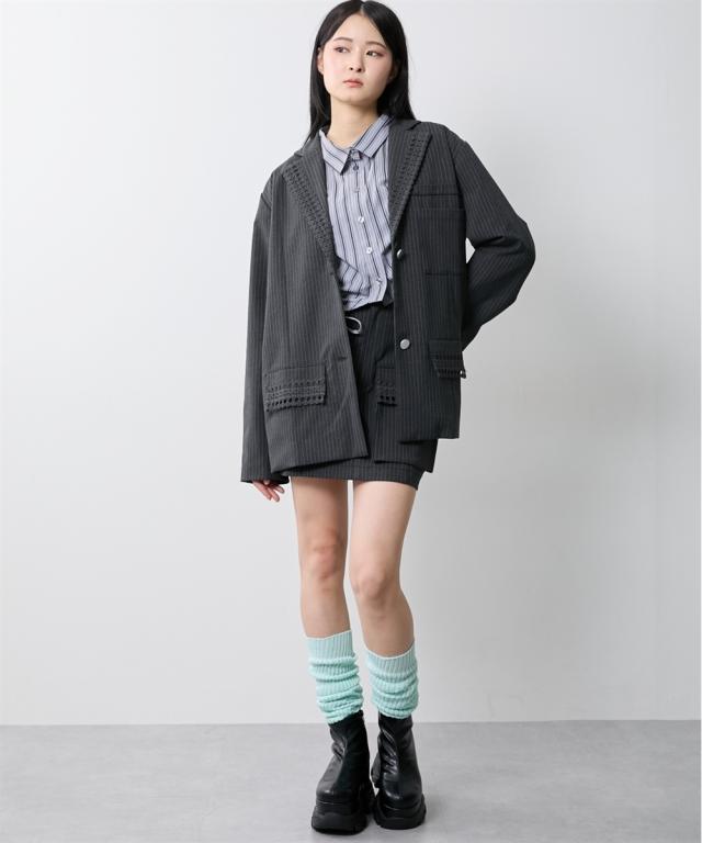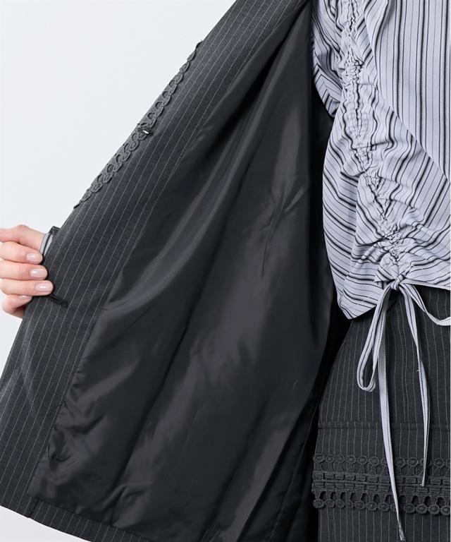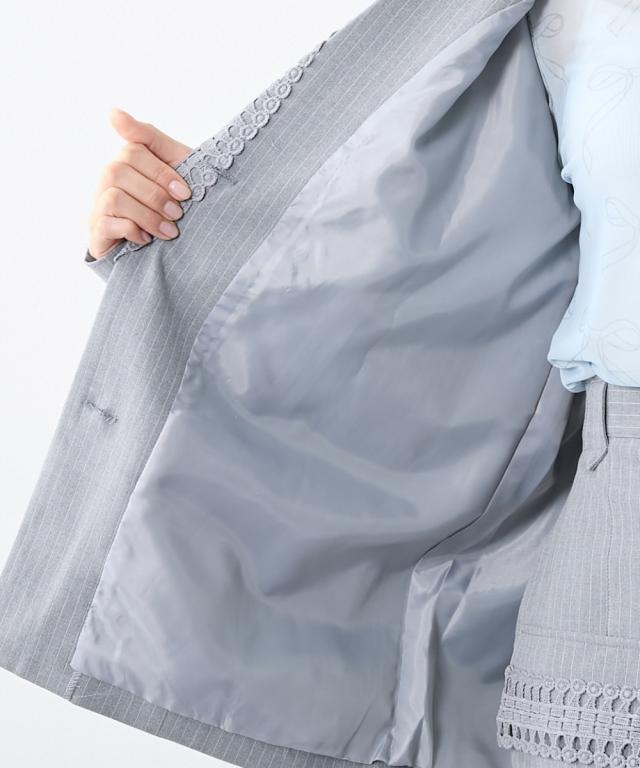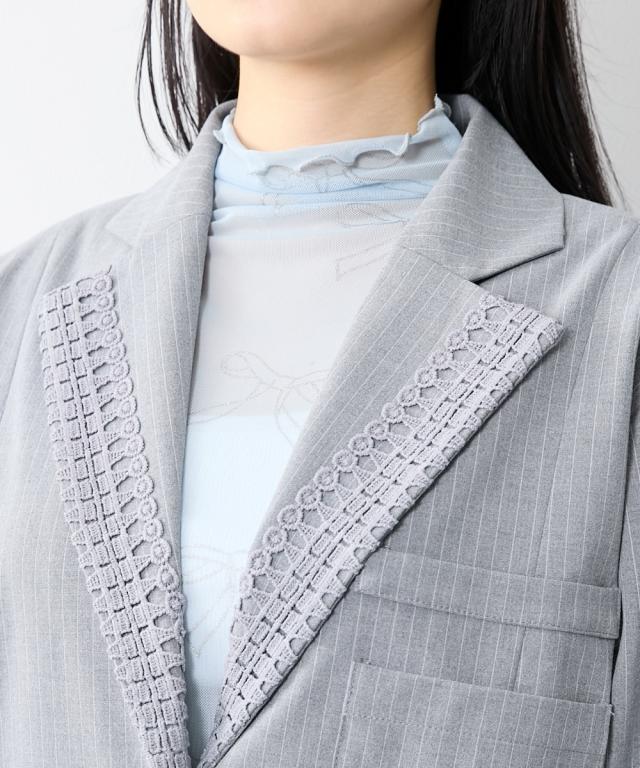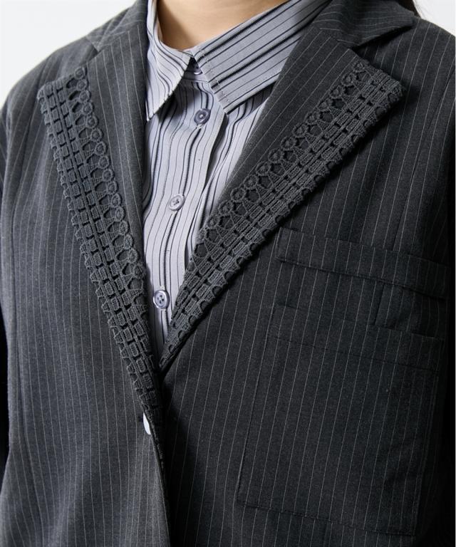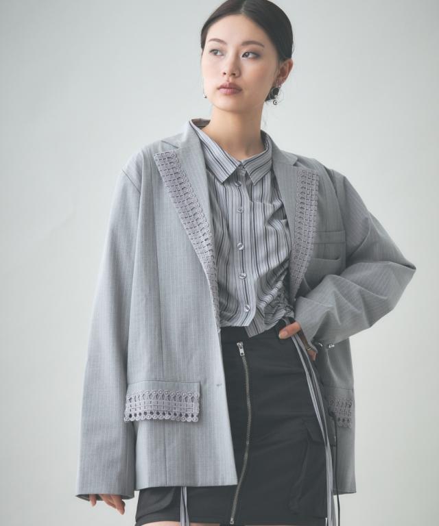 トレンドのメンズライクなサイズシルエットのジャケット。衿とポケット口にレースをあしらってトレンドのガーリー要素をプラス。レースは身生地同色に染めているため甘すぎないルックに。共生地ミニスカートとのセットアップもおすすめです。
