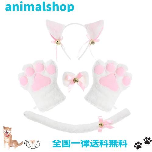 YFFSFDC 猫耳カチューシャ ねこ コスチューム 4点セット コスプレ 小物 チョーカー 肉球手袋 しっぽ 蝶結び 鈴設計 可愛い ハロウィン 仮