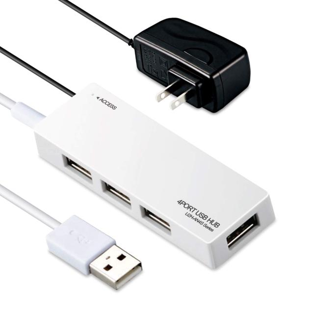 ACアダプターが付属するセルフパワー・バスパワー共用タイプの4ポートUSBハブです。
