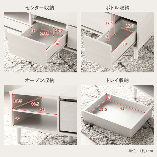 ●本商品は仕入元より配送となるため、北海道・沖縄・離島への配送はできません。 【サイズ(約)】 幅95×奥行45×高さ38cm 脚の高さ:13cm 【重量(約)】 26kg 【材質】 主材:プリント紙化粧繊維板、脚部:天然木 【カラー】 チャコールグレー、ホワイト、ナチュラル、ストーンホワイト 【生産国】 インドネシア製 【商品に関するご注意】 ・本品はお客様にて組立ての作業が必要となります。 ・プラスドライバーとハンマーをご用意ください。 ・大人2人以上での組立てをおすすめします。(組立て時間:約2.5時間) ・商品の組立て開始前に、部材不足・破損がないか必ずご確認ください。 ・写真の色調はモニターの機種や設定、使用環境により実際の商品と異なる色味に感じる場合があります。 ・製品のデザイン・仕様・梱包は予告なく変更することがございます。あらかじめご了承ください。 ・水分や汚れが付いた場合...