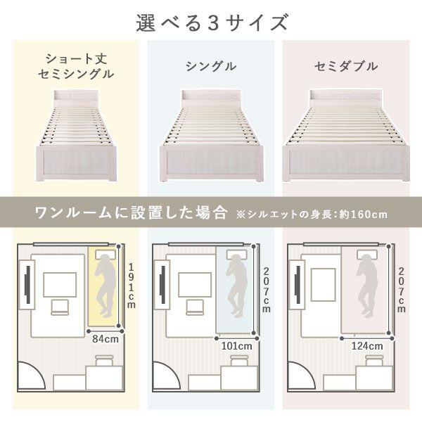 ●本商品は仕入元より配送となるため、沖縄・離島への配送はできません。 【ベッドフレーム本体】 ■サイズ(約) ショート丈セミシングル:幅84×長さ191×高さ78(77.2)cm シングル:幅101×長さ207×高さ78(77.2)cm セミダブル:幅124×長さ207×高さ78(77.2)cm ■材質 フレーム:天然木パイン材(表面加工:ラッカー塗装) すのこ:LVL サイドフレーム:突板化粧合板 ■機能 2口コンセント(1500W) ※全サイズ右側に1つ 高さ調整可能(2段階) ■耐荷重(約) ショート丈セミシングル:120kg シングル:120kg セミダブル:180kg ■カラー ホワイトウォッシュ、ナチュラル、ブラウン ■生産国 中国 ■梱包サイズ(約) 2梱包 ショート丈セミシングル:(1)幅94×奥行62.5×高さ11.5cm・18.5kg、(2)幅77×奥行28×高さ8.5cm・9...
