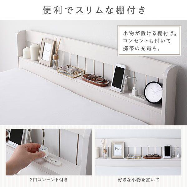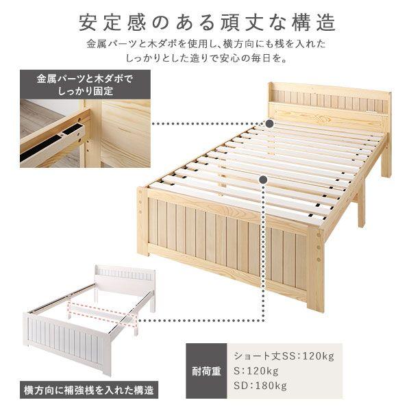 ●本商品は仕入元より配送となるため、沖縄・離島への配送はできません。 【ベッドフレーム本体】 ■サイズ(約) ショート丈セミシングル:幅84×長さ191×高さ78(77.2)cm シングル:幅101×長さ207×高さ78(77.2)cm セミダブル:幅124×長さ207×高さ78(77.2)cm ■材質 フレーム:天然木パイン材(表面加工:ラッカー塗装) すのこ:LVL サイドフレーム:突板化粧合板 ■機能 2口コンセント(1500W) ※全サイズ右側に1つ 高さ調整可能(2段階) ■耐荷重(約) ショート丈セミシングル:120kg シングル:120kg セミダブル:180kg ■カラー ホワイトウォッシュ、ナチュラル、ブラウン ■生産国 中国 ■梱包サイズ(約) 2梱包 ショート丈セミシングル:(1)幅94×奥行62.5×高さ11.5cm・18.5kg、(2)幅77×奥行28×高さ8.5cm・9...