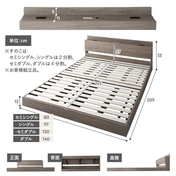 ●本商品は仕入元より配送となるため、沖縄・離島への配送はできません。 【ベッドフレーム本体】 ■サイズ(約) セミシングル:幅80×長さ209×高さ55cm シングル:幅97×長さ209×高さ55cm セミダブル:幅120×長さ209×高さ55cm ダブル:幅140×長さ209×高さ55cm 床面までの高さ:12cm ※すのこは、セミシングル・シングルは2分割、セミダブル・ダブルは4分割 ■材質 合成樹脂化粧パーティクルボード、合板 ■カラー グレージュ、シャビーナチュラル ■耐荷重(約) セミシングル・シングル:120kg セミダブル・ダブル:200kg ■機能 セミシングル、シングル、セミダブル:2口コンセント(1500W)×1(右側) ダブル:2口コンセント(1500W)×2(左右両側に各1個) 共通:LED照明 コンセントコード長さ:(約)1.8m 照明用アダ...