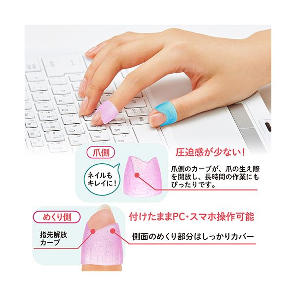 つけたままパソコン操作もしやすい形状のリング型指サック。ラメ入りで指先キラキラ。
