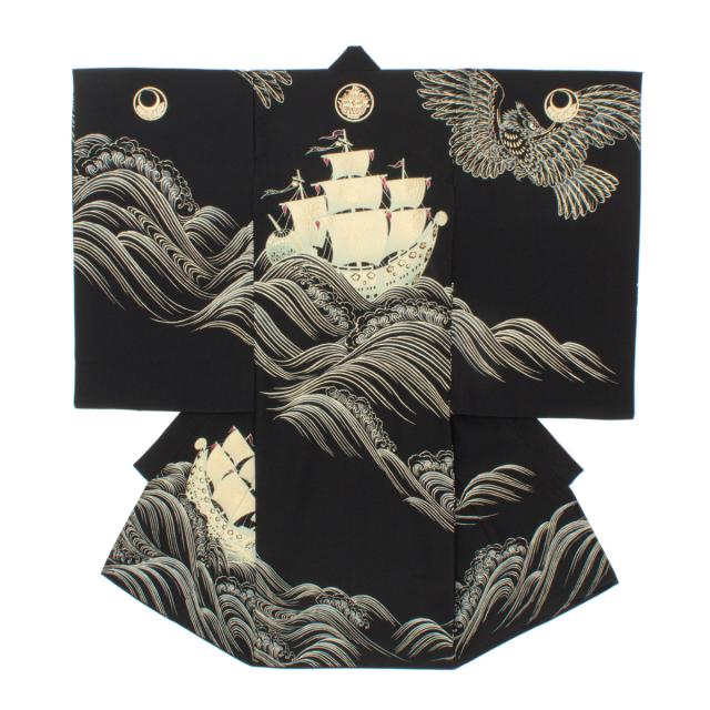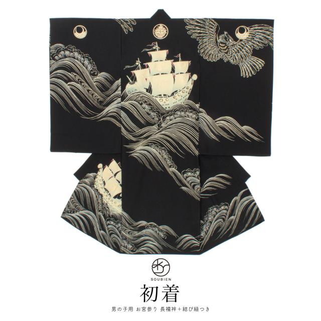 産着 男の子 販売 初着 黒 鷹 荒波 帆船 九重 掛け着 お祝い着 祝着 お宮参り ポリエステル 赤ちゃん 男児 仕立て上がり 日本製