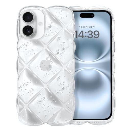?【iPhone 16 対応】このiPhone16クリアケースは透明TPUとウェーブエッジ、背面ダイヤモンドひし形ふわふわとアルミ箔シルバーキラキラ装飾で作られており、光の下でダイヤモンドのように輝き、高級感を醸し出します。