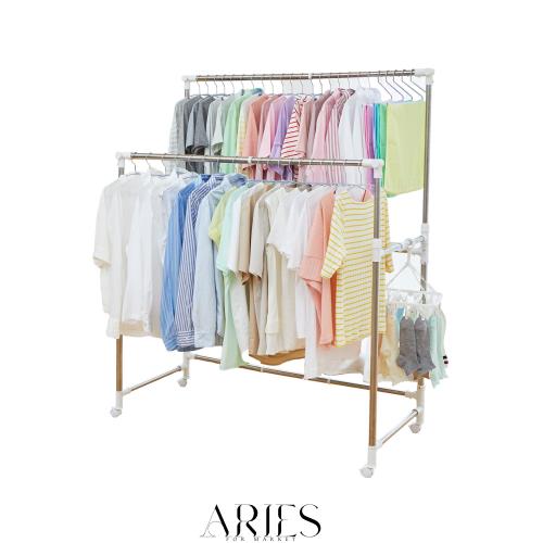 干し部がはみ出さずバランスよく干せる安定形状。従来よりも太いパイプを使用しており、たくさん干しても安定して干すことが可能。マンションの手すりよりも低めに高さを設定できるので、目隠ししたいときや置きスペースに合わせてご使用いただけます。伸縮式物干し竿が3本付属していて、完成品の為、すぐにご使用いただけます。
