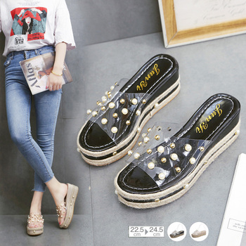 パールスタッズにクリア素材のレディースライクなウェッジヒールサンダル