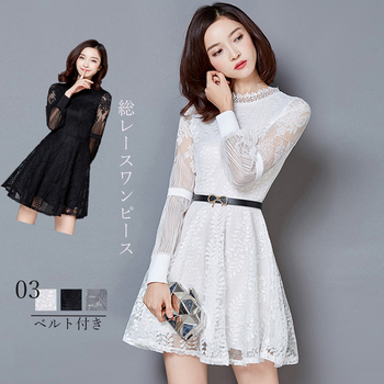 ワンピース 総レース レディース フレアワンピ スカラップ ベルト付き パーティードレス 送料無料 即日発送