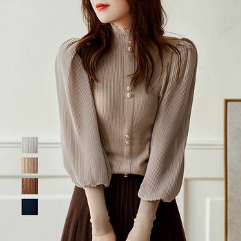 レディース 袖切り替え シフォンプリーツ ブラウス パフスリーブ ドッキングニット プチハイネック トップス 春秋冬プルオーバーニット 襟フリルニットソー オフィスカジュアル