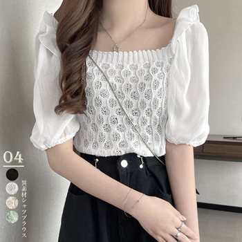 ドッキングシャツ 異素材ミックス パフスリーブ ニットブラウス 風 ショート丈 ニットトップス 春夏 大人可愛い着やせサマーニット 半袖 無地トップス 鎖骨見せ シャツ